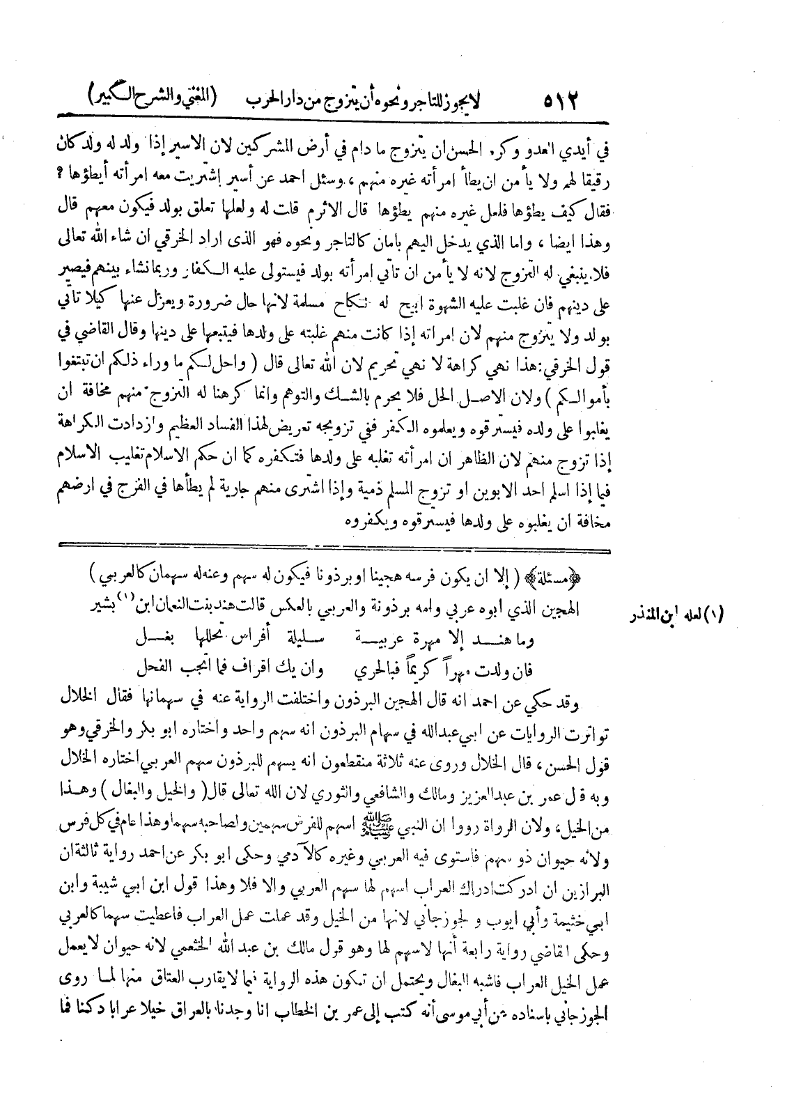 (مسألة) (إلا أن يكون فرسه هجينا أو برذونا فيكون له سهم وعنه له سهمان كالعربي) الهجين الذي أبوه عربي وأمه برذونه والعربي بالعكس قالت هند بنت النعمان ابن (1) بشير وما هند إلا مهرة عربية سليلة أفراس تحللها بغسل فإن ولدت مهراً كريماً فبالحري وإن يك أقراف فما اتجب الفحل وقد حكي عن أحمد أنه قال الهجين البرذون واختلفت الرواية عنه في سهمانها فقال الخلال تواترت الروايات عن أبي عبد الله في سهام البرذون أنه سهم واحد واختاره أبو بكر والخرقي وهو قول الحسن، قال الخلال وروى عنه ثلاثة منقطعون أنه يسهم للبرذون سهم العربي اختاره الخلال وبه قال عمر بن عبد العزيز ومالك والشافعي والثوري لأن الله تعالى قال (والخيل والبغال) وهذا من الخيل، ولأن الرواة رووا أن النبي صلى الله عليه وسلم أسهم للفرس سهمين ولصاحبه سهما وهذا عام في كل فرس ولأنه حيوان ذو سهم فاستوى فيه العربي وغيره كالآدمي وحكى أبو بكر عن أحمد رواية ثالثة ان البرازين إن أدركت إدراك العراب أسهم لها سهم العربي وإلا فلا وهذا قول ابن أبي شيبة وابن
