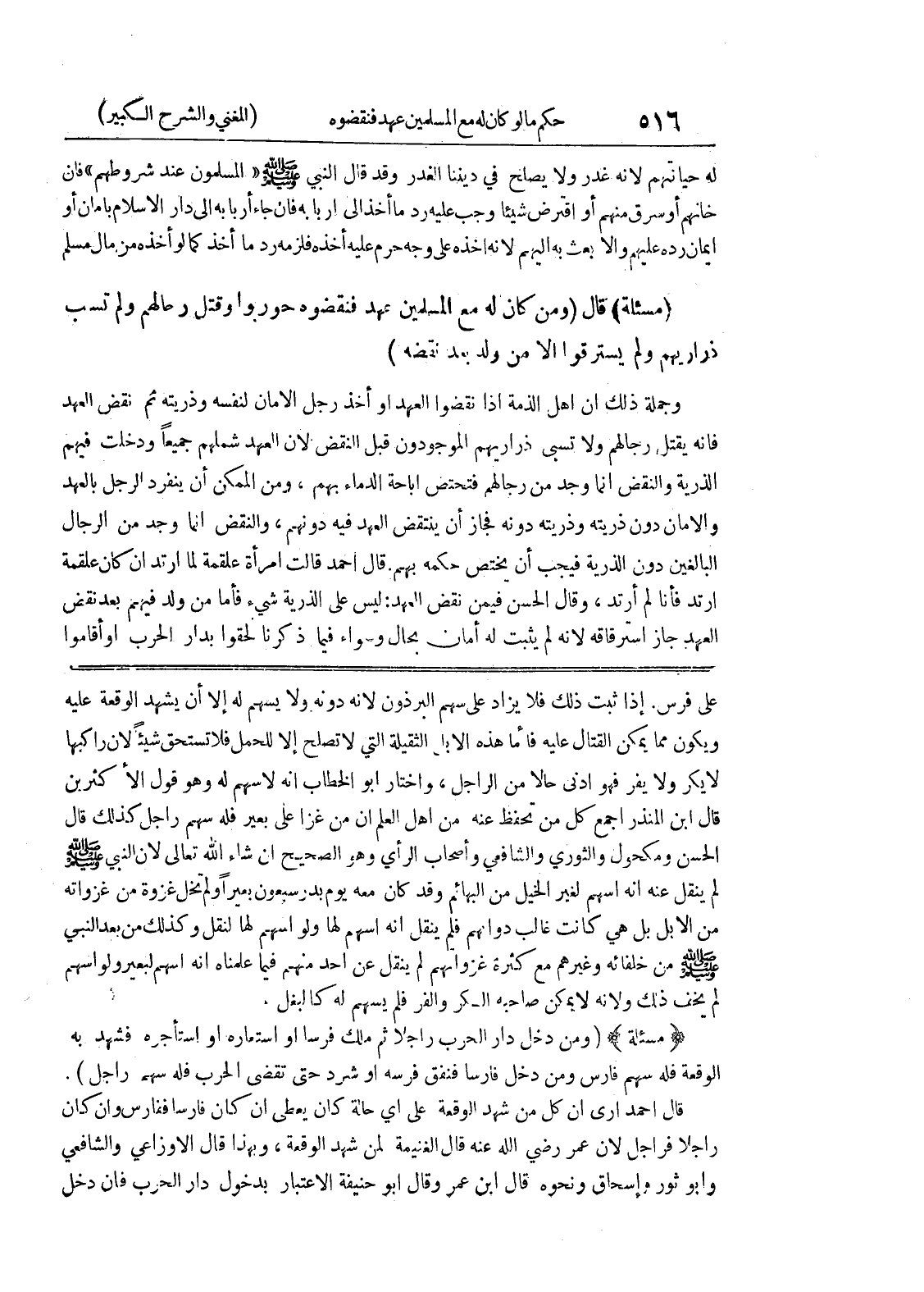 على فرس إذا ثبت ذلك فلا يزاد على سهم البرذون لأنه دونه ولا يسهم له إلا أن يشهد الوقعة عليه ويكون مما يمكن القتال عليه فأما هذه الإبل الثقيلة التي لا تصلح إلا للحمل فلا تستحق شيئاً لأن راكبها لا يكر ولا يفر فهو أدنى حالا من الراجل، واختار أبو الخطاب أنه لا سهم له وهو قول الأكثرين قال إبن المنذر أجمع كل من تحفظ عنه من أهل العلم أن من غزا على بعير فله سهم راجل كذلك قال الحسن ومكحول والثوري والشافعي وأصحاب الراي وهو الصحيح إن شاء الله تعالى لأن النبي صلى الله عليه وسلم لم ينقل عنه أنه أسهم لغير الخيل من البهائم وقد كان معه يوم بدر سبعون بعيراً ولم تخل غزوة من غزواته من الابل بل هي كانت غالب دوابهم فلم ينقل أنه أسهم لها ولو اسهم لها لنقل وكذلك من بعد النبي صلى الله عليه وسلم من خلفائه وغيرهم مع كثرة غزواتهم لم ينقل عن أحد منهم فيما علمناه أنه أسهم لبعير ولو أسهم لم يخف ذلك ولأنه لا يمكن صاحبه الكر والفر فلم يسهم له كالبغل.