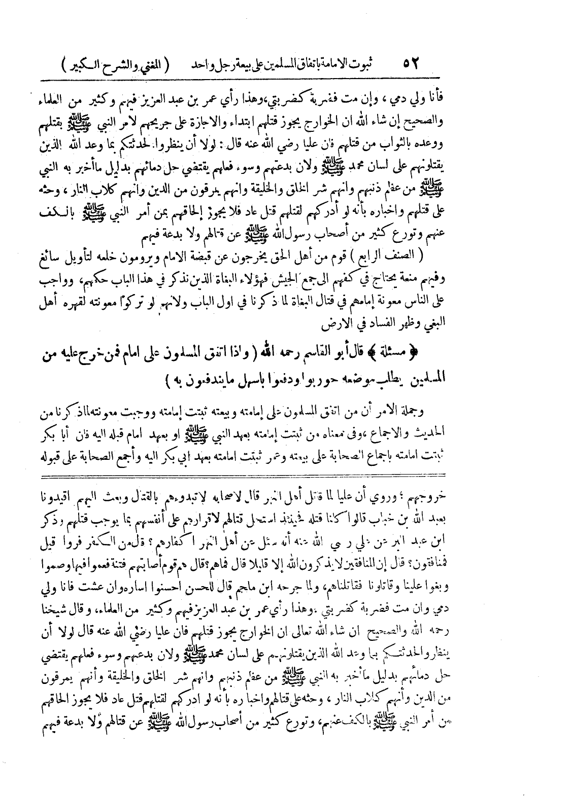 خروجهم: وروي أن عليا لما قاتل أهل النهر قال لاصحابه لا تبدوءهم بالقتال وبعث اليهم اقيدونا بعبد الله بن خباب قالوا كلنا قتله فحينئذ استحل قتالهم لا قرارهم على أنفسهم بما يوجب قتلهم وذكر ابن عبد البر عن علي رضي الله عنه أنه سئل عن أهل النهر أكفار هم؟ قال من الكفر فروا قيل فمنافقون؟ قال إن المنافقين لا يذكرون الله إلا قليلا قال فماهم؟ قال هم قوم أصابتهم فتنة فعموا فيها وصموا وبغوا علينا وقاتلونا فقاتلناهم، ولما جرحه ابن ملجم قال للحسن أحسنوا إساره وان عشت فانا ولي دمي وان مت فضربة كضربتي وهذا رأي عمر بن عبد العزيز فيهم وكثير من العلماء، وقال شيخنا رحمه الله والصحيح إن شاء الله تعالى ان الخوارج يجوز قتلهم فان علياً رضي الله عنه قال لولا أن
