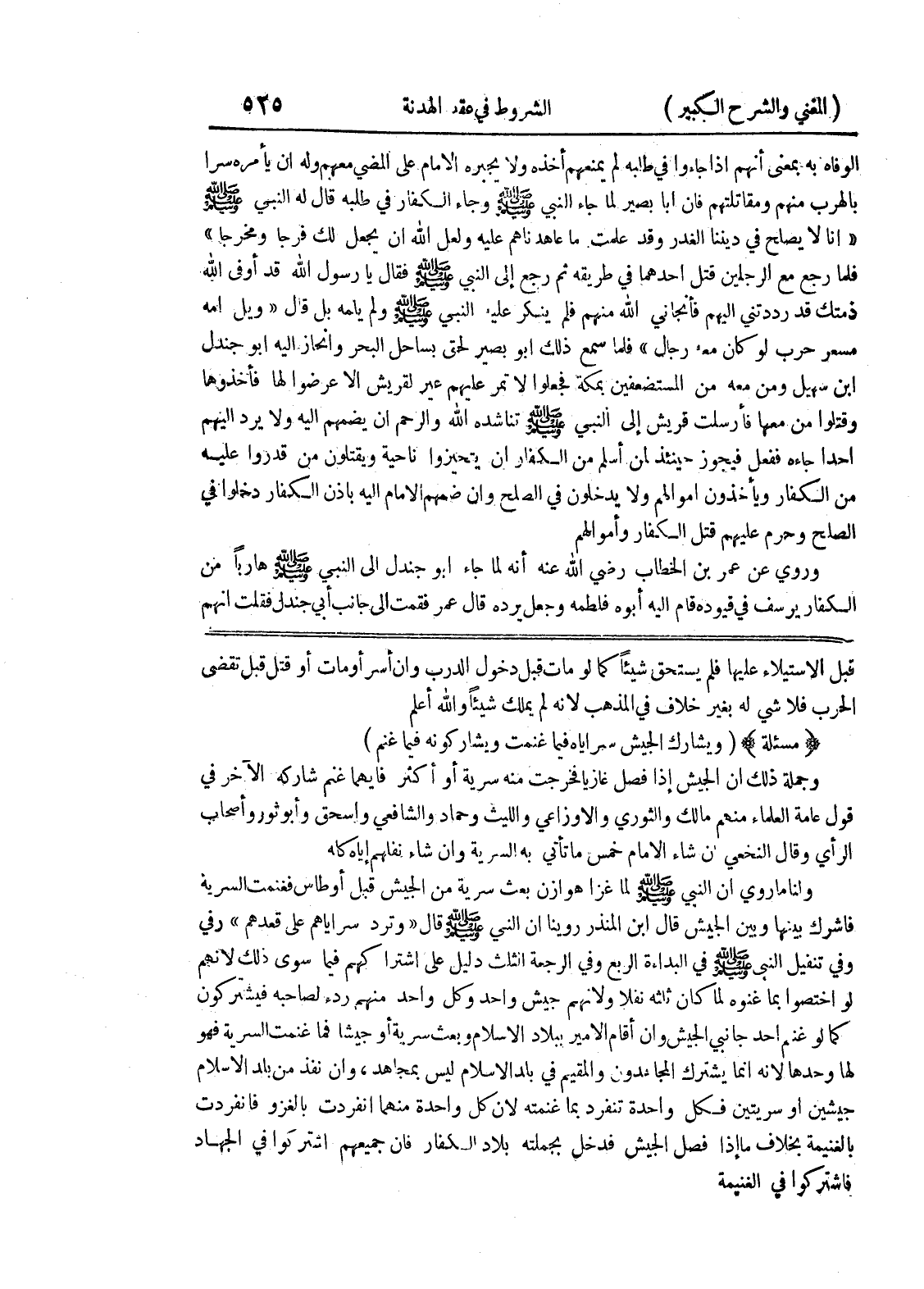 قبل الاستيلاء عليها فلم يتسحق شيئاً كما لو مات قبل دخول الدرب وإن أسر أو مات أو قتل قبل تقضي الحرب فلا شي له بغير خلاف في المذهب لأنه لم يملك شيئاً والله أعلم (مسألة) (ويشارك الجيش سراياه فيما غنمت ويشاركونه فيما غنم) وجملة ذلك أن الجيش إذا فصل غازياً فخرجت منه سرية أو أكثر فأيهما غنم شاركه الآخر في قول عامة العلماء منهم مالك والثوري والاوزاعي والليث وحماد والشافعي واسحق وأبو ثور وأصحاب الرأي وقال النخعي إن شاء الإمام خمس ما تأتي به السرية وإن شاء نفلهم إياه كله ولنا ماروي أن النبي صلى الله عليه وسلم لما غزا هوازن بعث سرية من الجيش قبل أوطاس فغنمت السرية فأشرك بينها وبين الجيش قال إبن المنذر روينا أن النبي صلى الله عليه وسلم قال (وترد سراياهم على قعدهم) رفي وفي تنفيل النبي صلى الله عليه وسلم في البداءة الربع وفي الرجعة الثلث دليل على اشتراكهم فيما سوى ذلك لأنهم لو اختصوا بما غنموه لما كان ثلثه نفلا ولأنهم جيش واحد وكل واحد منهم ردء لصاحبه فيشتركون كما لو غنم أحد جانبي الجيش وان أقام الأمير ببلاد الإسلام وبعث سرية أو جيشا فما غنمت السرية فهو لها وحدها لأنه إنما يشترك المجاهدون والمقيم في بلد الإسلام ليس بمجاهد، وإن نفذ من بلد الإسلام جيشين أو سريتين فكل واحدة تنفرد بما غنمته لأن كل واحدة منهما انفردت بالغزو فانفردت بالغنيمة بخلاف ما إذا فصل الجيش فدخل بجملته بلاد الكفار فان جميعهم اشتركوا في الجهاد فاشتركوا في الغنيمة