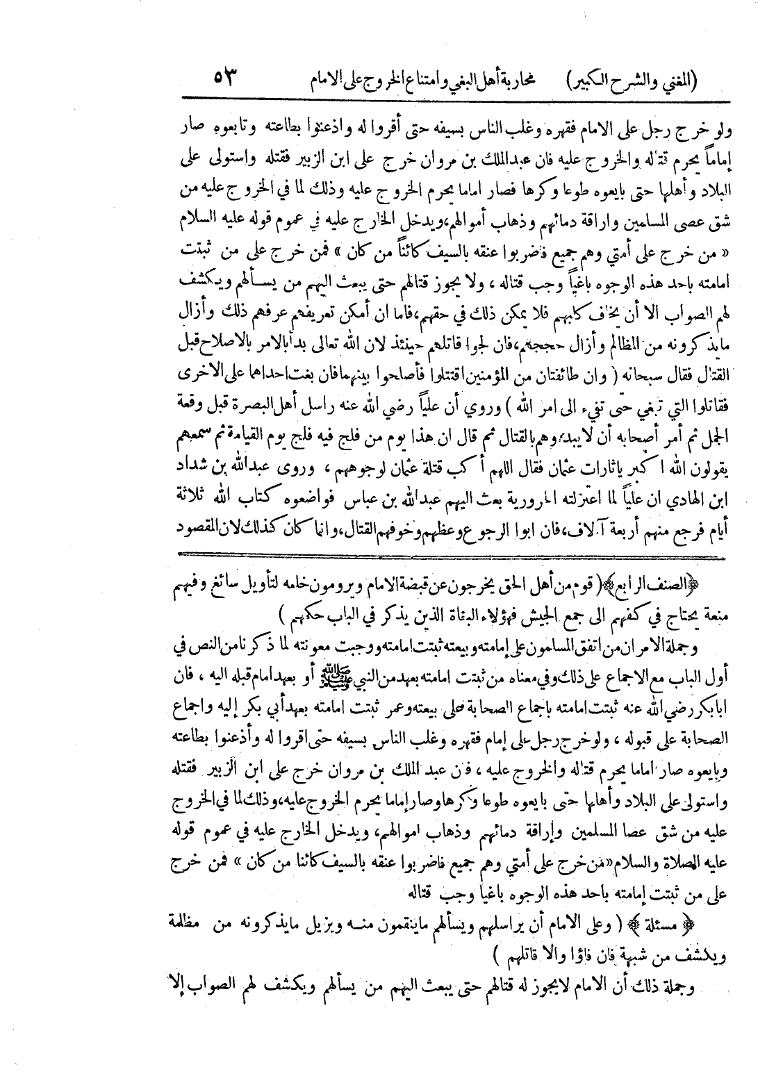 (الصنف الرابع) (قوم من أهل الحق يخرجون عن قبضة الامام ويرومون خلعه لتأويل سائغ وفيهم منعة يحتاج في كفهم الى جمع الجيش فهؤلاء البغاة الذين يذكر في الباب حكمهم) وجملة الامران من اتفق المسلمون على إمامته وبيعته ثبتت امامة ووجبت معونته لما ذكرنا من النص في أول الباب مع الاجماع على ذلك وفي معناه من ثبتت إمامته بعهد من النبي صلى الله عليه وسلم أو بعهد امام قبله اليه، فان أبا بكر رضي الله عنه ثبتت امامته باجماع الصحابة على بيعته وعمر ثبتت إمامته بعهد أبي بكر إليه واجماع الصحابة على قبوله، ولو خرج رجل على إمام فقهره وغلب الناس بسيفه حتى أقروا له وأذعنوا بطاعته وبايعوه صار اماماً يحرم قتاله والخروج عليه، فان عبد الملك بن مروان خرج على ابن الزبير فقتله واستولى على البلاد وأهلها حتى بايعوه طوعاً وكرهاً وصار إماماً يحرم الخروج عليه، وذلك لما في الخروج عليه من شق عصا المسلمين إراقة دمائهم وذهاب أموالهم، ويدخل الخارج عليه في عموم قوله عليه الصلاة والسلام (من خرج على أمتي وهم جميع فاضربوا عنقه بالسيف كائناً من كان) فمن خرج على من ثبتت إمامته بأحد هذه الوجوه باغيا وجب قتاله (مسألة) (وعلى الامام أن يراسلهم ويسألهم ما ينقمون منه ويزل ما يذكرونه من مظلمة ويكشف من شبهة فان فاؤا والا قاتلهم) وجملة ذلك أن الامام لا يجوز له قتالهم حتى يبعث اليهم من يسألهم ويكشف لهم الصواب إلا