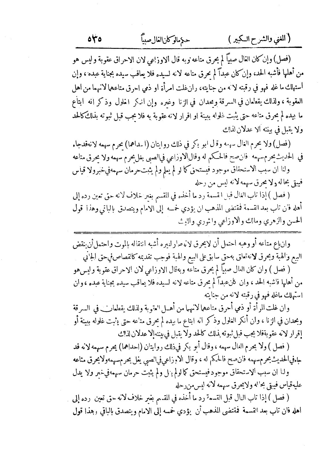 وإن باع متاعه أو وهبه احتمل أن لا يحرق لأنه صار لغيره أشبه انتقاله بالموت واحتمل أن ينقض البيع والهبة ويحرق لأنه تعلق به حق سابق على البيع والهبة فوجب تقديمه كالقصاص في حق الجاني (فصل) وإن كان العال صبياً لم يحرق متاعه وبه قال الأوزاعي لان الاحراق عقوبة وليس هو من أهلها فأشبه الحد، وإن كان عبداً لم يحرق متاعه لأنه لسيده فلا يعاقب سيده بجناية عبده، وإن استهلك ما غله فهو في رقبته لأنه من جنايته وإن غلت المرأة أو ذمي أحرق متاعهما لأنهما من أهل العقوبة ولذلك يقطعان في السرقة ويحدان في الزنا، وإن أنكر الغلول وذكر أنه ابتاع ما بيده لم يحرق متاعه حتى يثبت غلوله ببينة أو إقرار لأنه عقوبة قلا يجب قبل ثبوته بذلك كالحد ولا يقبل في بينته إلا عدلان لذلك (فصل) ولا يحرم الغال سهمه، وقال أبو بكر في ذلك روايتان (إحداهما) يحرم سهمه لأنه قد جاء في الحديث يحرم سهمه فإن صح فالحكم له، وقال الأوزاعي في الصبي يغل يحرم سهمه ولا يحرق متاعه ولنا أن سبب الاستحقاق موجود فيستحق كما لو لم يغل ولم يثبت حرمان سهمه في خبر ولا يدل عليه قياس فيبقى بحاله ولا يحرق سهمه لأنه ليس من رحله (فصل) إذا تاب الغال قبل القسمة رد ما أخذه في المقسم بغير خلاف لأنه حق تعين رده إلى أهله فإن تاب بعد القسمة فمقتضى المذهب أن يؤدي خمسه إلى الإمام ويتصدق بالباقي وهذا قول