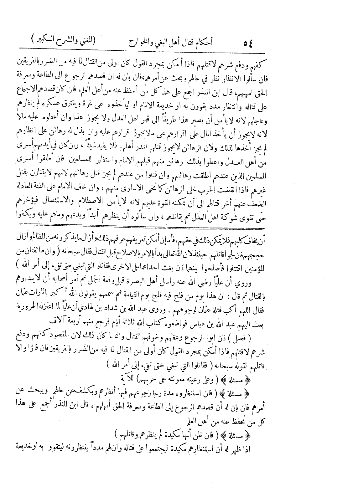 وروى عبد الله بن شداد بن الهادي أن علياً لما اعتزله الحرورية بعث إليهم عبد الله بن عباس فواضعوه كتاب الله ثلاثة أيام فرجع منهم أربعة آلاف (فصل) فان أبوا الرجوع وعظهم وخوفهم القتال وإنما كان ذلك لأن المقصود كفهم ودفع شرهم لا قتلهم فاذا أمكن بمجرد القول كان أولى من القتال لما فيه من الضرر بالفريقين فان فاؤا والا قاتلهم لقوله سبحانه (فقاتلوا التي تبغي حتى تفئ إلى أمر الله) (مسألة) (وعلى رعيته معونته على حربهم) للآية (مسألة) (فان استنظروه مدة رجا رجوعهم فيها أنظرهم ويكشف عن حالهم ويبحث عن أمرهم فان بان له أن قصدهم الرجوع إلى الطاعة ومعرفة الحق أمهلهم، قال إبن المنذر أجمع على هذا كل من نحفظ عنه من أهل العلم (مسألة) (فان ظن أنها مكيدة لم ينظرهم وقاتلهم) اذا ظهر له أن اتسنظارهم مكيدة ليجتمعوا على قتاله وان لهم مدداً ينتظرونه ليتقووا به أو خديعة
