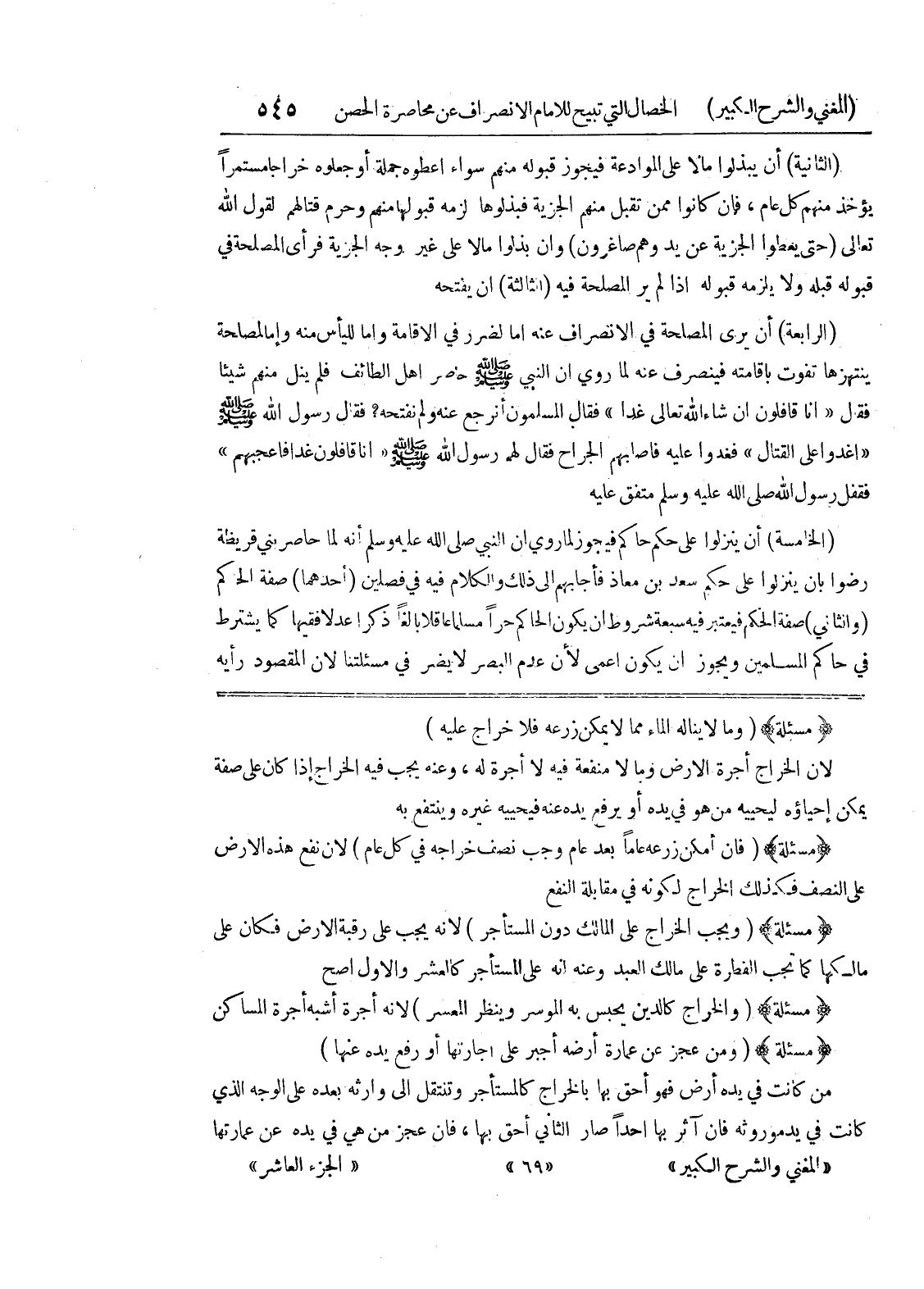 يمكن إحياؤه ليحييه من هو في يده أو يرفع يده عنه فيحييه غيره وينتفع به (مسألة) (فإن أمكن زرعه عاماً بعد عام وجب نصف خراجه في كل عام) لأن نفع هذه الأرض على النصف فكذلك الخراج لكونه في مقابلة النفع (مسألة) (ويجب الخراج على المالك دون المستأجر) لأنه يجب على رقبة الأرض فكان على مالكها كما تجب الفطرة على مالك العبد وعنه أنه على المستأجر كالعشر والأول أصح (مسألة) (والخراج كالدين يحبس به الموسر وينظر المعسر) لأنه أجرة أشبه أجرة المساكن (مسألة) (ومن عجز عن عمارة أرضه أجبر على إجارتها أو رفع يده عنها) من كانت في يده أرض فهو أحق بها بالخراج كالمستأجر وتنتقل إلى وارثه بعده على الوجه الذي كانت في يد موروثه فإن آثر بها أحداً صار الثاني أحق بها، فإن عجز من هي في يده عن عمارتها
