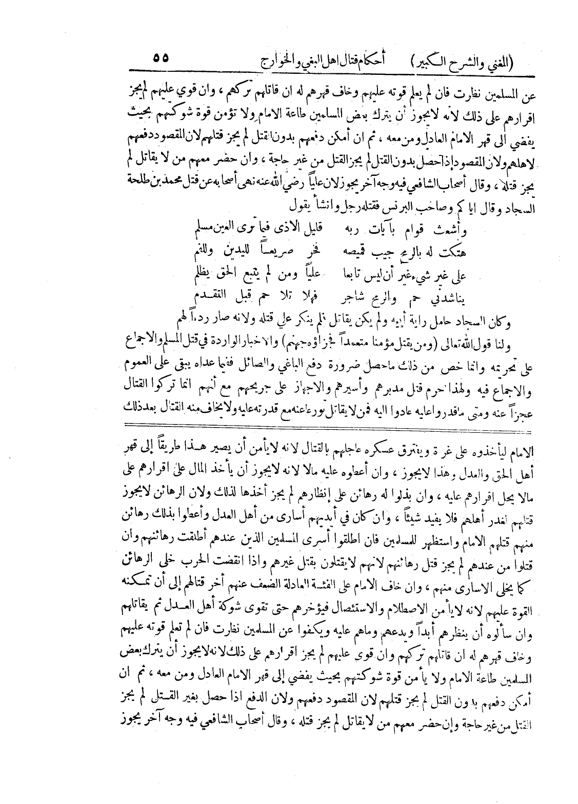 القوة عليهم لأنه لا يأمن الاصطلام والاستئصال فيؤخرهم حتى تقوى شوكة أهل العدل ثم يقاتلهم وان سألوه أن ينظرهم أبداو يدعهم وماهم عليه ويكفوا عن المسلمين نظرت فان لم تعلم قوته عليهم وخاف قهرهم له إن قاتلهم تركهم وان قوي عليهم لم يجز إقرارهم على ذلك لأنه لا يجوز أن يترك بعض المسلمين طاعة الامام لا يأمن قوة شوكتهم بحيث يفضي إلى قهر الامام العادل ومن معه، ثم ان أمكن دفعهم بدون القتل لم يجز قتلهم لأن المقصود دفعهم ولأن الدفع إذا حصل بغير القتل لم يجز القتل من غير حاجة وإن حضر معهم من لا يقاتل لم يجز قتله، وقال أصحاب الشافعي فيه وجه آخر يجوز