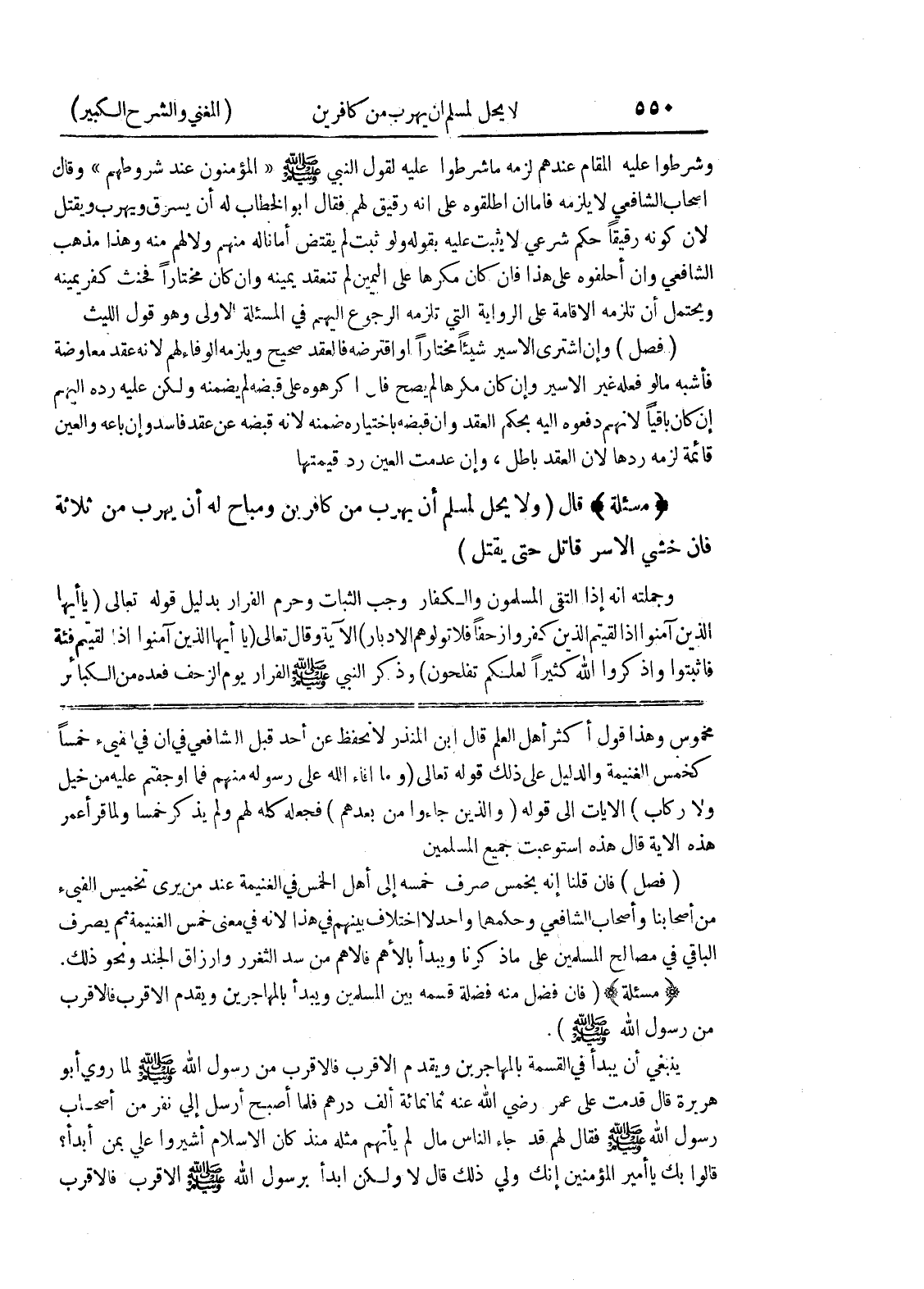 مخموس وهذا قول أكثر أهل العلم قال ابن المنذر لانحفظ عن أحد قبل الشافعي في أن في الفيئ خمساً كخمس الغنيمة والدليل على ذلك قوله تعالى (وما أفاء الله على رسوله منهم فما أوجفتم عليه من خيل ولا ركاب) الآيات إلى قوله (والذين جاءوا من بعدهم) فجعله كله لهم ولم يذكر خمساً ولما قرأ عمر هذه الآية قال هذه استوعبت جميع المسلمين (فصل) فان قلنا إنه يخمس صرف خمسه إلى أهل الخمس في الغنيمة عند من يرى تخميس الفيئ من أصحابنا وأصحاب الشافعي وحكمهما واحد لااختلاف بينهم في هذا لأنه في معنى خمس الغنيمة ثم يصرف الباقي في مصالح المسلمين على ما ذكرنا ويبدأ بالأهم فالأهم من سد الثغور وأرزاق الجند ونحو ذلك.