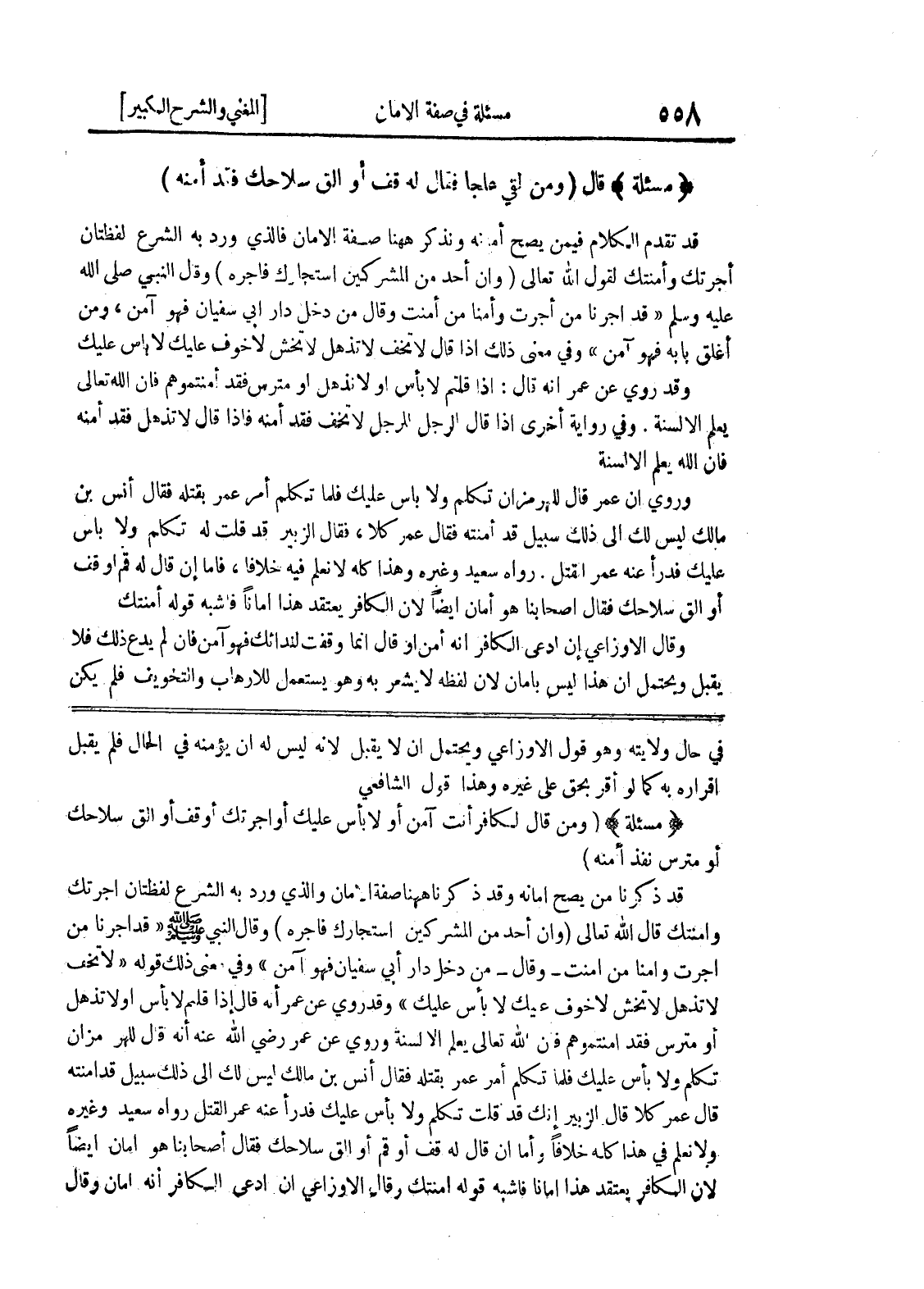 أجرت وأمنا من أمنت - وقال - من دخل دار أبي سفيان فهو آمن) وفي معنى ذلك قوله (لا تخف لا تذهل لا تخش لاخوف عليك لا بأس عليك) وقد روي عن عمر أنه قال إذا قلتم لا بأس أو لا تذهل أو مترس فقد أمنتموهم فإن الله تعالى يعلم الألسنة وروي عن عمر رضي الله عنه انه قال للهرمزان تكلم ولا بأس عليك فلما تكلم أمر عمر بقتله فقال أنس بن مالك ليس لك إلى ذلك سبيل قد أمنته قال عمر كلا قال الزبير إنك قد قلت تكلم ولا بأس عليك فدرأ عنه عمر القتل رواه سعيد وغيره ولا نعلم في هذا كله خلافاً وأما إن قال له قف أو قم أو ألق سلاحك فقال أصحابنا هو أمان أيضاً لأن الكافر يعتقد هذا أماناً فأشبه قوله أمنتك وقال الأوزاعي إن ادعى الكافر أنه أمان وقال