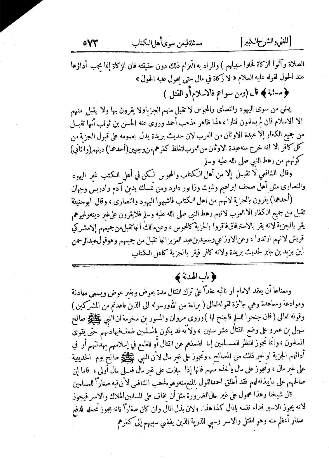 (باب الهدنة) ومعناها أن يعقد الإمام أو نائبه عقداً على ترك القتال مدة بعوض وبغير عوض ويسمى مهادنة وموادعة ومعاهدة وهي جائزة لقوله تعالى (براءة من الله ورسوله إلى الذين عاهدتم من المشركين) وقوله تعالى (فإن جنحوا للسلم فاجنح لها) وروى مروان والمسور بن مخرمة أن النبي صلى الله عليه وسلم صالح سهيل بن عمرو على وضع القتال عشر سنين، ولأنه قد يكون بالمسلمين ضعف فيهادنهم حتى يقوى المسلمون، وإنما تجوز للنظر للمسلمين أما لضعفهم عن القتال أو للطمع في إسلامهم بهدنتهم أو في أدائهم الجزية أو غير ذلك من المصالح، وتجوز على غير مال لأن النبي صلى الله عليه وسلم صالح يوم الحديبية على غير مال، وتجوز على مال يأخذه منهم فإنها إذا جازت على غير مال فعلى مال أولى، فأما إن