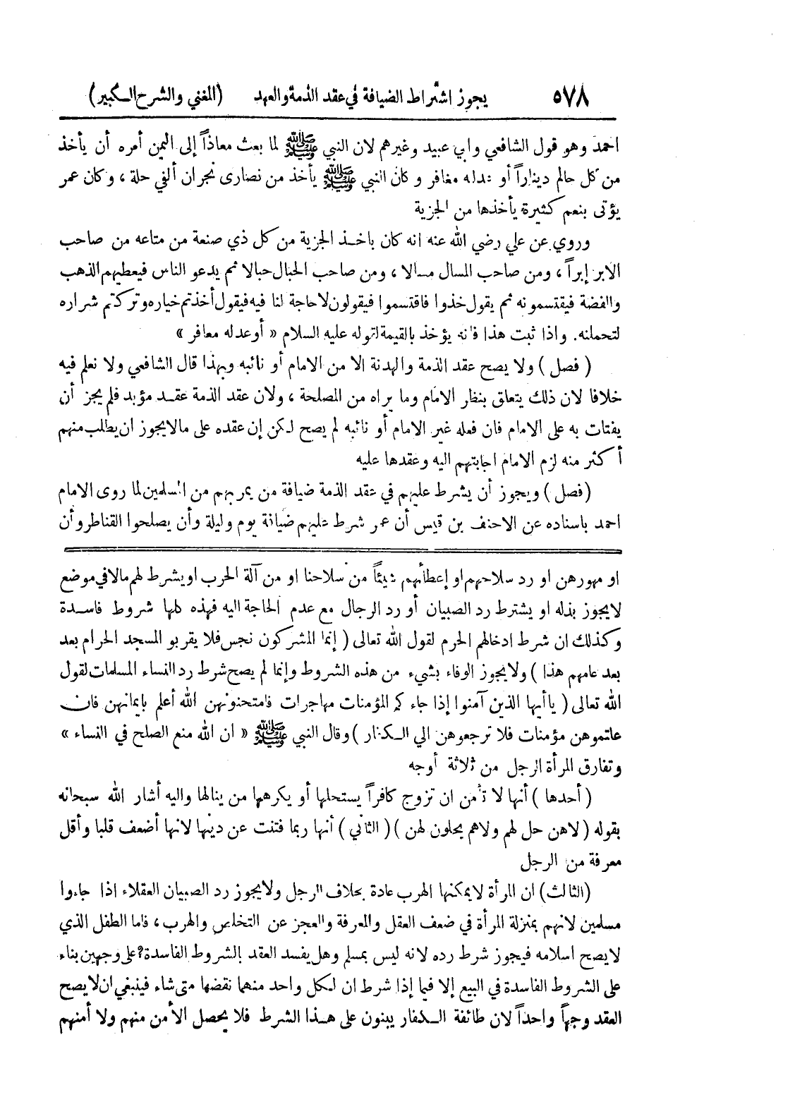 وكذلك إن شرط ادخالهم الحرم لقول الله تعالى (إنما المشركون نجس فلا يقربو المسجد الحرام بعد عامهم هذا) ولا يجوز الوفاء بشئ من هذه الشروط وإنما لم يصح شرط رد النساء المسلمات لقول الله تعالى (يا أيها الذين آمنوا إذا جاءكم المؤمنات مهاجرات فامتحنونهن الله أعلم بإيمانهن فإن علمتموهن مؤمنات فلا ترجعوهن إلى الكفار) وقال النبي صلى الله عليه وسلم (إن الله منع الصلح في النساء) وتفارق المرأة الرجل من ثلاثة أوجه (أحدها) أنها لا تأمن أن تزوج كافراً يستحلها أو يكرهها من ينالها واليه أشار الله سبحانه بقوله (لا هن حل لهم ولا هم يحلون لهن) (الثاني) إنها ربما فتنت عن دينها لأنها أضعف قلباً وأقل معرفة من الرجل (الثالث) أن المرأة لا يمكنها الهرب عادة بخلاف الرجل ولا يجوز رد الصبيان العقلاء إذا جاءوا مسلمين لانهم بمنزلة المرأة في ضعف العقل والمعرفة والعجز عن التخلص والهرب، فأما الطفل الذي لا يصح اسلامه فيجوز شرط رده لأنه ليس بمسلم وهل يفسد العقد بالشروط الفاسدة؟ على وجهين بناء على الشروط الفاسدة في البيع إلا فيما إذا شرط أن لكل واحد منهما نقضها متى شاء فينبغي أن لا يصح العقد وجهاً واحداً لأن طائفة الكفار يبنون على هذا الشرط فلا يحصل الأمن منهم ولا أمنهم