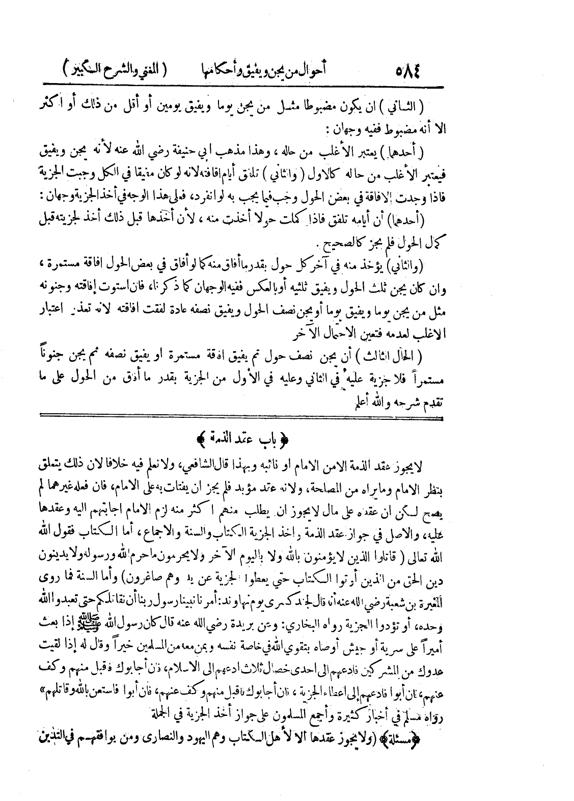 (باب عقد الذمة) لا يجوز عقد الذمة إلا من الإمام أو نائبه وبهذا قال الشافعي، ولا نعلم فيه خلافاً لأن ذلك يتعلق بنظر الإمام وما يراه من المصلحة، ولأنه عقد مؤبد فلم يجز أن يفتات به على الإمام، فإن فعله غيرهما لم يصح لكن إن عقده على مال لا يجوز أن يطلب منهم أكثر منه لزم الإمام إجابتهم إليه وعقدها عليه، والأصل في جواز عقد الذمة وأخذ الجزية الكتاب والسنة والإجماع، أما الكتاب فقول الله تعالى (قاتلوا الذين لا يؤمنون بالله ولا باليوم الآخر ولا يحرمون ما حرم الله ورسوله ولا يدينون دين الحق من الذين أوتوا الكتاب حتى يعطوا الجزية عن يد وهم صاغرون) وأما السنة فما روى المغيرة بن شعبة رضي الله عنه انه قال لجند كسرى يوم نهاوند: أمرنا نبينا رسول ربنا أن نقاتلكم حتى تعبدوا الله وحده، أو تؤدوا الجزية رواه البخاري: وعن بريدة رضي الله عنه قال كان رسول الله صلى الله عليه وسلم إذا بعث أميراً على سرية أو جيش أوصاه بتقوى الله في خاصة نفسه وبمن معه من المسلمين خيراً وقال له إذا لقيت عدوك من المشركين فادعهم إلى إحدى خصال ثلاث ادعهم إلى الإسلام، فإن أجابوك فاقبل منهم وكف عنهم، فإن أبوا فادعهم إلى إعطاء الجزية، فإن أجابوك فاقبل منه وكف عنهم، فإن أبوا فاستعن بالله وقاتلهم) رواه مسلم في أخبار كثيرة وأجمع المسلمون على جواز أخذ الجزية في الجملة (مسألة) (ولا يجوز عقدها إلا لأهل الكتاب وهم اليهود والنصارى ومن يوافقهم في التدين