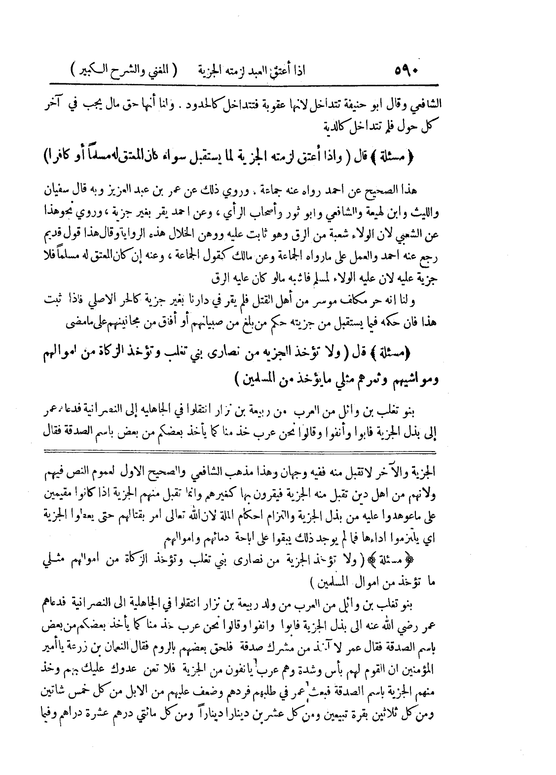 (مسألة) (ولا تؤخذ الجزية من نصارى بني تغلب وتؤخذ الزكاة من أموالهم مثلي ما تؤخذ من أموال المسلمين) بنو تغلب بن وائل من العرب من ولد ربيعة بن نزار انتقلوا في الجاهلية إلى النصرانية فدعاهم عمر رضي الله عنه إلى بذل الجزية فأبوا وأنفوا وقالوا نحن عرب خذ منا كما يأخذ بعضكم من بعض باسم الصدقة فقال عمر لا آخذ من مشرك صدقة فلحق بعضهم بالروم فقال النعمان بن زرعة يا أمير المؤمنين إن القوم لهم بأس وشدة وهم عرب يأنفون من الجزية فلا تعن عدوك عليك بهم وخذ منهم الجزية باسم الصدقة فبعث عمر في طلبهم فردهم وضعف عليهم من الابل من كل خمس شاتين ومن كل ثلاثين بقرة تبيعين ومن كل عشرين دينارا دينارا ومن كل مائتي درهم عشرة دراهم وفيما