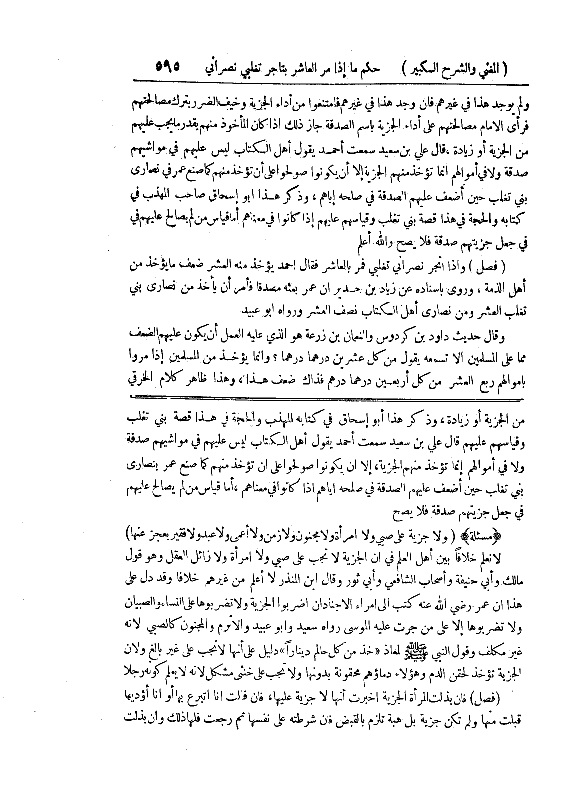 من الجزية أو زيادة، وذكر هذا أبو إسحاق في كتابه المهذب والحجة في هذا قصة بني تغلب وقياسهم عليهم قال علي بن سعيد سمعت أحمد يقول أهل الكتاب ليس عليهم في مواشيهم صدقة ولا في أموالهم إنما تؤخذ منهم الجزية، إلا أن يكونوا صولحوا على أن تؤخذ منهم كما صنع عمر بنصارى بني تغلب حين أضعف عليهم الصدقة في صلحه إياهم إذا كانوا في معناهم، أما قياس من لم يصالح عليهم في جعل جزيتهم صدقة فلا يصح (مسألة) (ولا جزية على صبي ولا امرأة ولا مجنون ولا زمن ولا أعمى ولا عبد ولا فقير يعجز عنها) لا نعلم خلافاً بين أهل العلم في أن الجزية لا تجب على صبي ولا امرأة ولا زائل العقل وهو قول مالك وأبي حنيفة وأصحاب الشافعي وأبي ثور وقال ابن المنذر لا أعلم من غيرهم خلافاً وقد دل على هذا أن عمر رضي الله عنه كتب إلى أمراء الأجناد أن اضربوا الجزية ولا تضربوها على النساء والصبيان ولا تضربوها إلا على من جرت عليه الموسى رواه سعيد وابو عبيد والاثرم والمجنون كالصبي لأنه غير ملكف وقول النبي صلى الله عليه وسلم لمعاذ (خذ من كل حالم دينارا) دليل على أنها لا تجب على غير بالغ ولأن الجزية تؤخذ لحقن الدم وهؤلاء دماؤهم محقونة بدونها ولا تجب على خنثى مشكل لأنه لا يعلم كونه رجلاً (فصل) فإن بذلت المرأة الجزية أخبرت أنها لا جزية عليها، فإن قالت أنا أتبرع بها أو أنا أؤديها قبلت منها ولم تكن جزية بل هبة تلزم بالقبض فإن شرطته على نفسها ثم رجعت فلها ذلك وإن بذلت