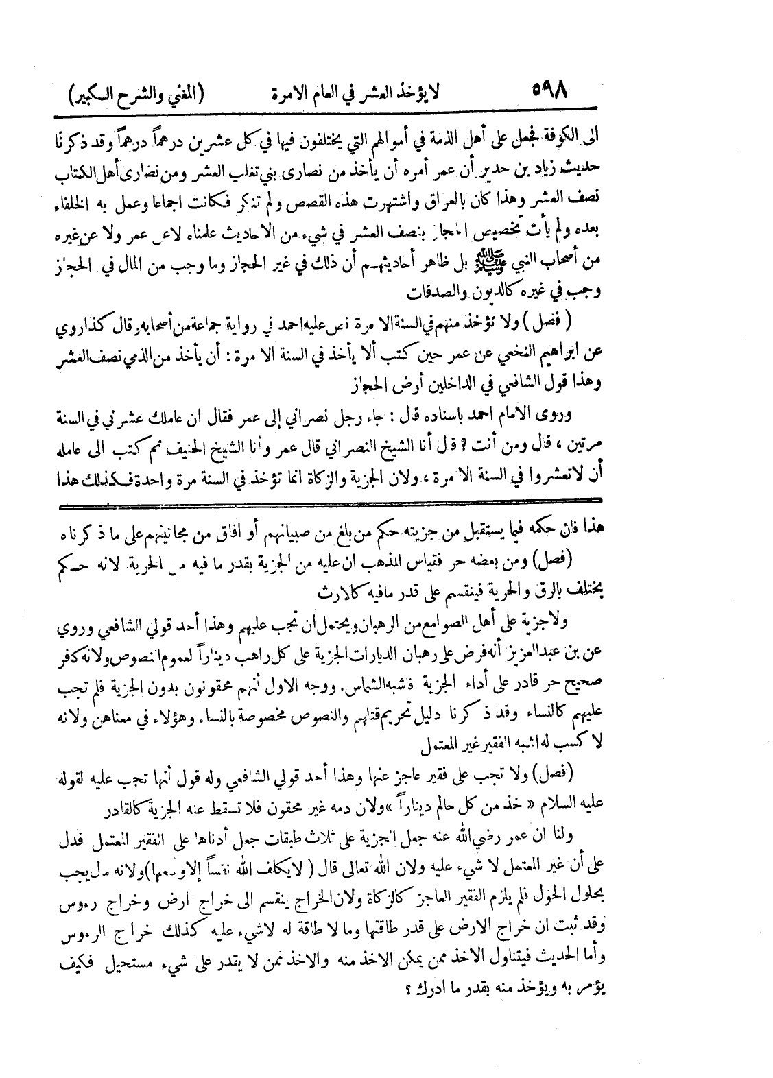 ووجه الأول أنهم محقونون بدون الجزية فلم تجب عليهم كالنساء وقد ذكرنا دليل تحريم قتلهم والنصوص مخصوصة بالنساء وهؤلاء في معناهن ولأنه لا كسب له أشبه الفقير غير المعتمل (فصل) ولا تجب على فقير عاجز عنها وهذا أحد قولي الشافعي وله قول أنها تجب عليه لقوله عليه السلام (خذ من كل حالم ديناراً) ولأن دمه غير محقون فلا تسقط عنه الجزية كالقادر ولنا أن عمر رضي الله عنه جعل الجزية على ثلاث طبقات جعل أدناها على الفقير المعتمل فدل على أن غير المعتمل لا شئ عليه ولأن الله تعالى قال (لا يكلف الله نفسا إلا وسعها) ولأنه مال يجب بحلول الحول فلم يلزم الفقير العاجز كالزكاة ولأن الخراج ينقسم إلى خراج أرض وخراج رؤوس وقد ثبت أن خراج الأرض على قدر طاقتها وما لا طاقة له لا شئ عليه كذلك خراج الرؤوس وأما الحديث فيتناول الأخذ ممن يمكن الأخذ منه والأخذ ممن لا يقدر على شئ مستحيل فكيف يؤمر به ويؤخذ منه بقدر ما أدرك؟