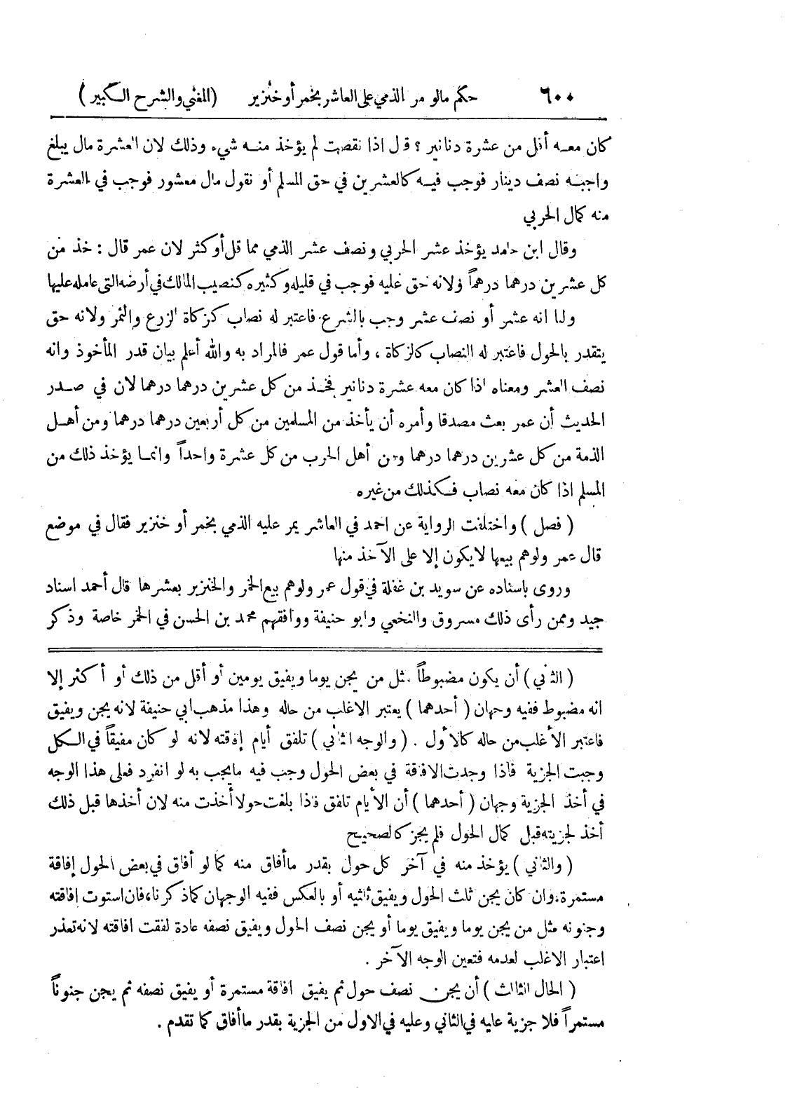 (والوجه الثاني) تلفق أيام إفاقته لأنه لو كان مفيقاً في الكل وجبت الجزية فإذا وجدت الإفاقة في بعض الحول وجب فيه ما يجب به لو انفرد فعلى هذا الوجه في أخذ الجزية وجهان (أحدهما) أن الأيام تلفق فإذا بلغت حولاً أخذت منه لأن أخذها قبل ذلك أخذ لجزيته قبل كمال الحول فلم يجز كالصحيح (والثاني) يؤخذ منه في آخر كل حول بقدر ما أفاق منه كما لو أفاق في بعض الحول إفاقة مستمرة، وإن كان يجن ثلث الحول ويفيق ثلثيه أو بالعكس ففيه الوجهان كما ذكرنا، فإن استوت إفاقته وجنونه مثل من يجن يوماً ويفيق يوماً أو يجن نصف الحول ويفيق نصفه عادة لفقت إفاقته لأنه تعذر