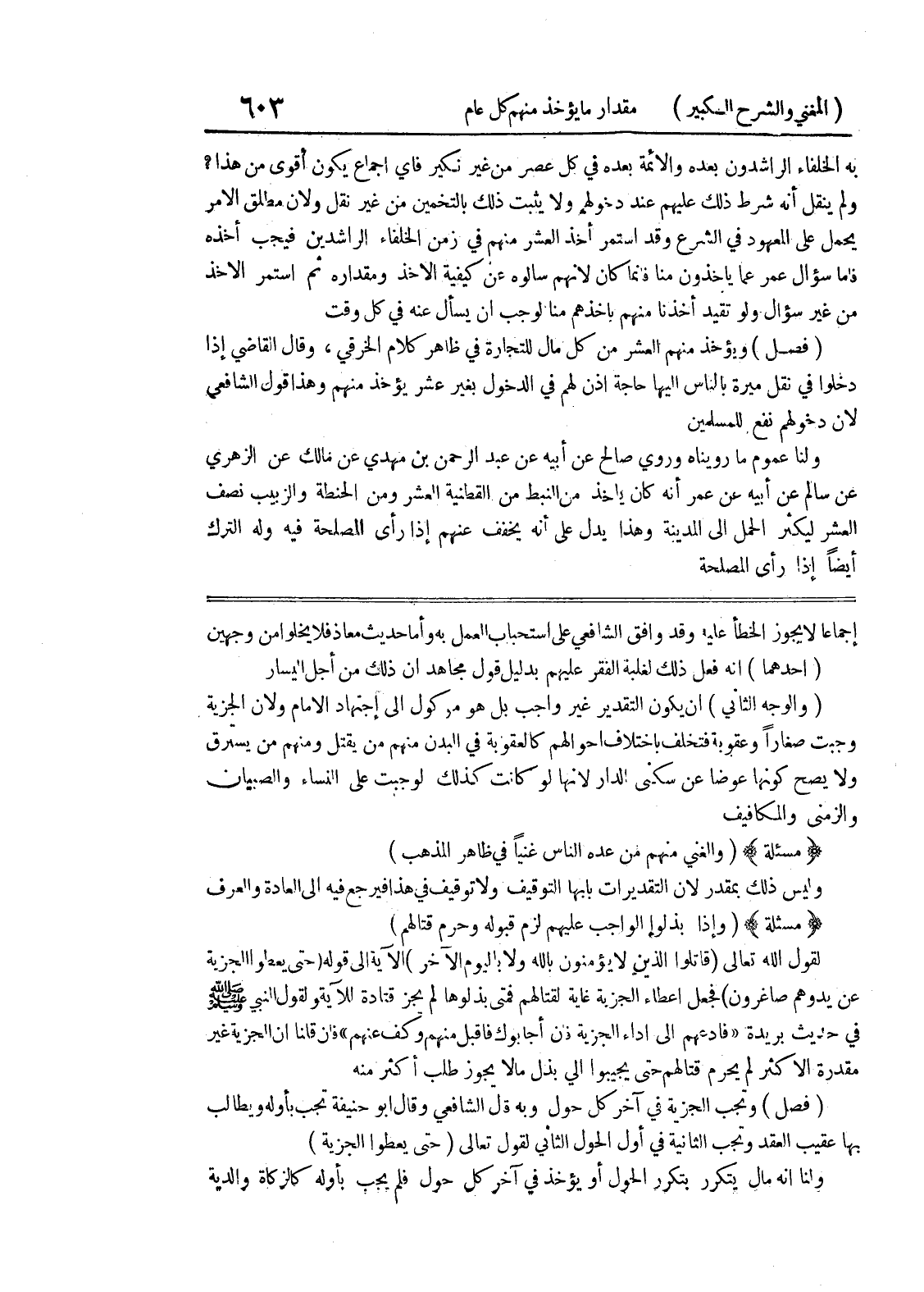 إجماعاً لا يجوز الخطأ عليه وقد وافق الشافعي على استحباب العمل به وأما حديث معاذ فلا يخلوا من وجهين (أحدهما) أنه فعل ذلك لغلبة الفقر عليهم بدليل قول مجاهد أن ذلك من أجل اليسار (والوجه الثاني) أن يكون التقدير غير واجب بل هو موكول إلى اجتهاد الإمام ولأن الجزية وجبت صغارا وعقوبة فتخلف (فتختلف) باختلاف أحوالهم كالعقوبة في البدن منهم من يقتل ومنهم من يسترق ولا يصح كونها عوضاً عن سكنى الدار لأنها لو كانت كذلك لوجبت على النساء والصبيان والزمنى والمكافيف (مسألة) (والغني منهم من عده الناس غنياً في ظاهر المذهب) وليس ذلك بمقدر لأن التقديرات بابها التوقيف ولا توقيف في هذا فيرجع فيه إلى العادة والعرف (مسألة) (وإذا بذلوا الواجب عليهم لزم قبوله وحرم قتالهم) لقول الله تعالى (قاتلوا الذين لا يؤمنون بالله ولا باليوم الآخر) الآية إلى قوله (حتى يعطوا الجزية