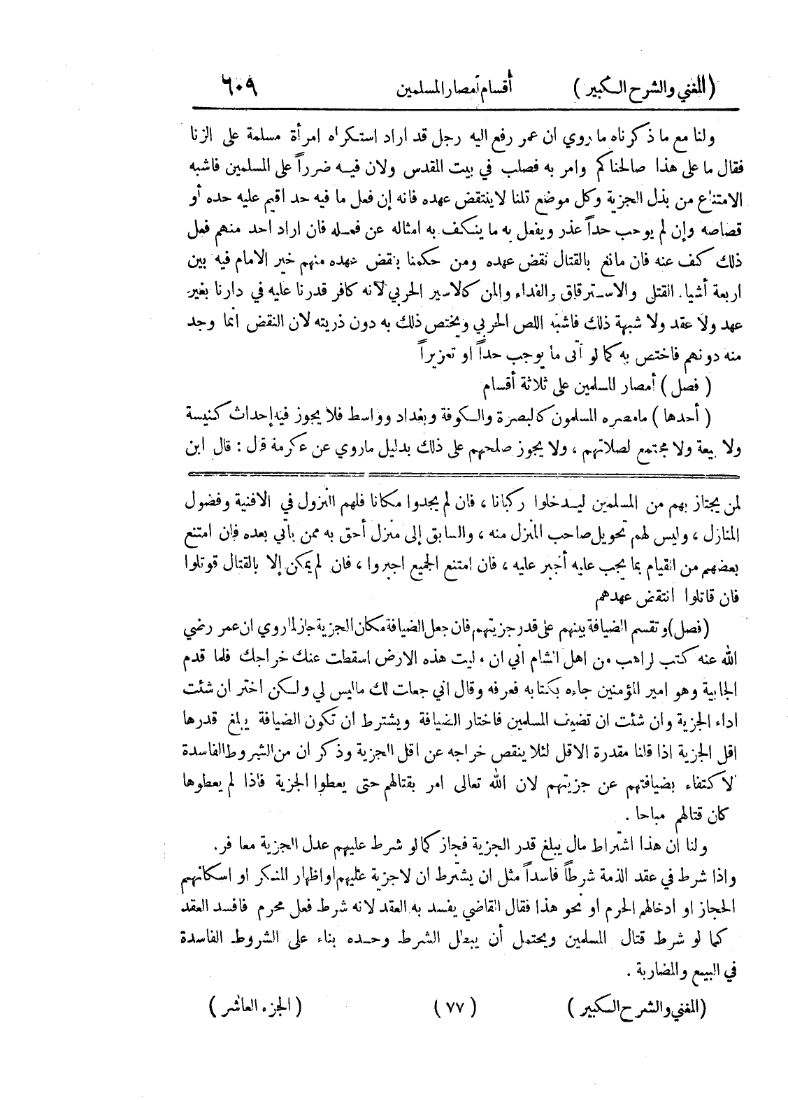 وإذا شرط في عقد الذمة شرطاً فاسداً مثل أن يشترط أن لا جزية عليهم أو إظهار المنكر أو اسكانهم الحجاز أو إدخالهم الحرم أو نحو هذا فقال القاضي يفسد به العقد لأنه شرط فعل محرم فأفسد العقد كما لو شرط قتال المسلمين ويحتمل أن يبطل الشرط وحده بناء على الشروط الفاسدة في البيع والمضاربة.