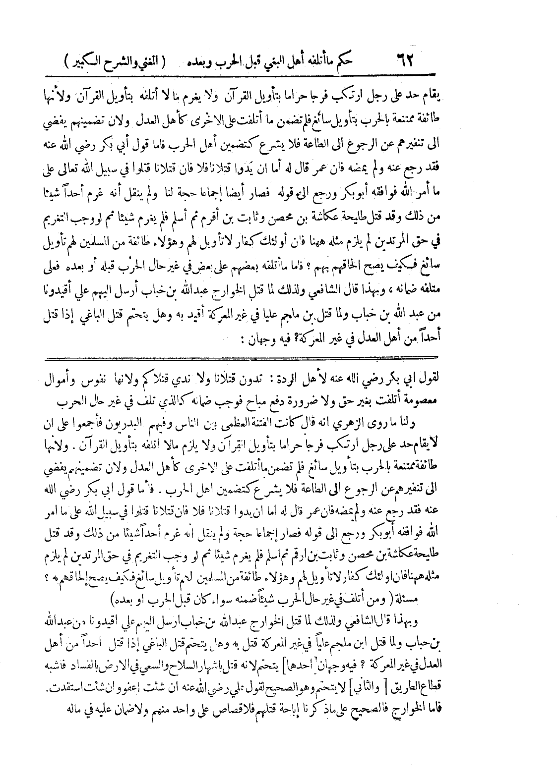 فأما قول أبي بكر رضي الله عنه فقد رجع عنه ولم يمضه فان عمر قال له اما ان يدوا قتلانا فلا فإن قتلانا قتلوا في سبيل الله على ما أمر الله فوافقه أبو بكر ورجع الى قوله فصار إجماعاً حجة ولم ينقل أنه غرم أحداً شيئاً من ذلك وقد قتل طليحة عكاشة بن محصن وثابت بن أرقم ثم أسلم فلم يغرم شيئاً ثم لو وجب التغريم في حق المرتدين لم يلزم مثله ههنا فإن أولئك كفار لا تأويل لهم وهؤلاء طائفة من المسلمين لهم تأويل سائغ فكيف يصح إلحاقهم به؟ مسألة (ومن أتلف في غير حال الحرب شيئاً ضمنه سواء كان قبل الحرب أو بعده) وبهذا قال الشافعي ولذلك لما قتل الخوارج عبد الله بن خباب أرسل اليهم علي أقيدونا من عبد الله بن حباب ولما قتل ابن ملجم علياً في غير المعركة قتل به وهل يتحتم قتل الباغي إذا قتل احداً من أهل العدل في غير المعركة؟ فيه وجهان [أحدهما] يتحتم لأنه قتل باشهار السلاح والسعي في الأرض بالفساد فأشبه قطاع الطريق [والثاني] لا يتحتم وهو الصحيح لقول علي رضي الله عنه ان شئت اعفو وان شئت استقدت.