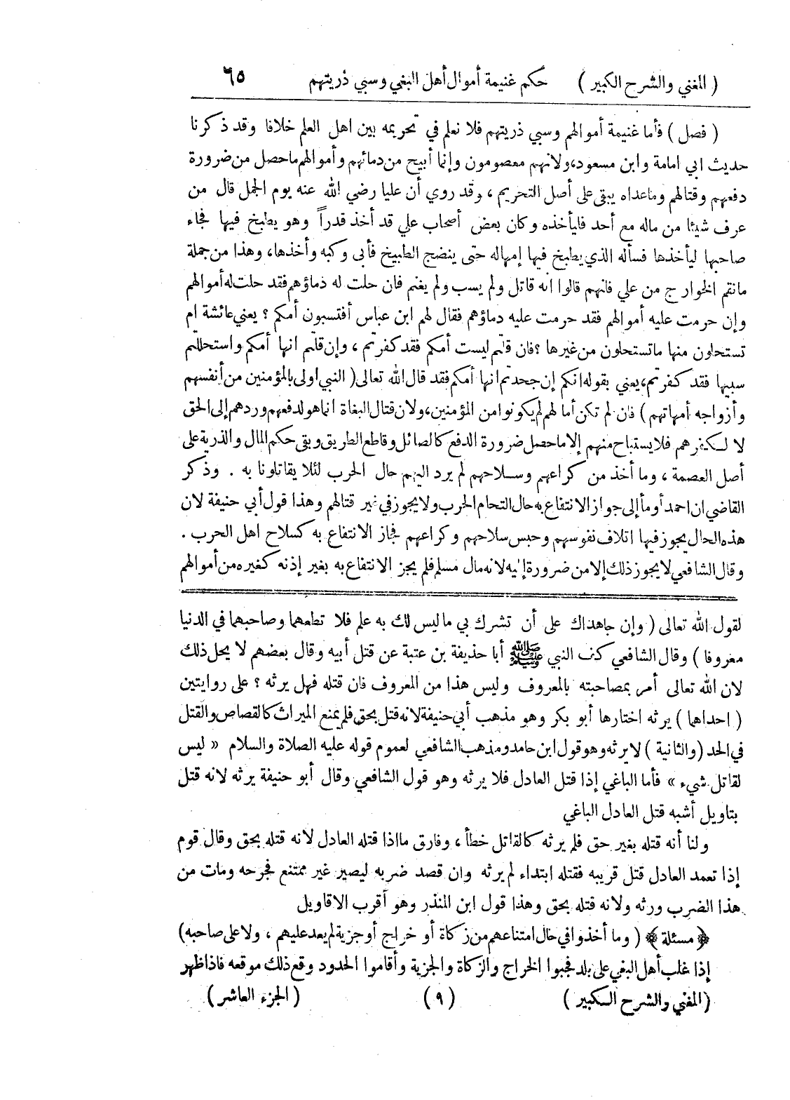 لقول الله تعالى (وإن جاهداك على أن تشرك بي ما ليس لك به علم فلا تطعهما وصاحبهما في الدنيا معروفا) وقال الشافعي كف النبي صلى الله عليه وسلم أبا حذيفة بن عتبة عن قتل أبيه وقال بعضهم لا يحل ذلك لأن الله تعالى أمر بمصاحبته بالمعروف وليس هذا من المعروف فان قتله فهل يرثه؟ على روايتين (إحداهما) يرثه اختارها أبو بكر وهو مذهب أبي حنيفة لأنه قتل بحق فلم يمنع الميراث كالقصاص والقتل في الحد (والثانية) لا يرثه وهو قول ابن حامد ومذهب الشافعي لعموم قوله عليه الصلاة والسلام (ليس لقاتل شئ) فأما الباغي إذا قتل العادل فلا يرثه وهو قول الشافعي وقال أبو حنيفة يرثه لأنه قتل بتأويل أشبه قتل العادل الباغي ولنا أنه قتله بغير حق فلم يرثه كالقتل خطأ، وفارق ما إذا قتله العادل لأنه قتله بحق وقال قوم إذا تعمد العادل قتل قريبه فقتله ابتداء لم يرثه وان قصد ضربه ليصير غير ممتنع فجرحه ومات من هذا الضرب ورثه ولأنه قتله بحق وهذا قول ابن المنذر وهو أقرب الاقاويل (مسألة) (وما أخذوا في حال امتناعهم من زكاة او خراج أو جزية لم يعد عليهم، ولا على صاحبه) إذا غلب أهل البغي على بلد فجبوا الخراج والزكاة والجزية وأقاموا الحدود وقع ذلك موقعه فإذا ظهر