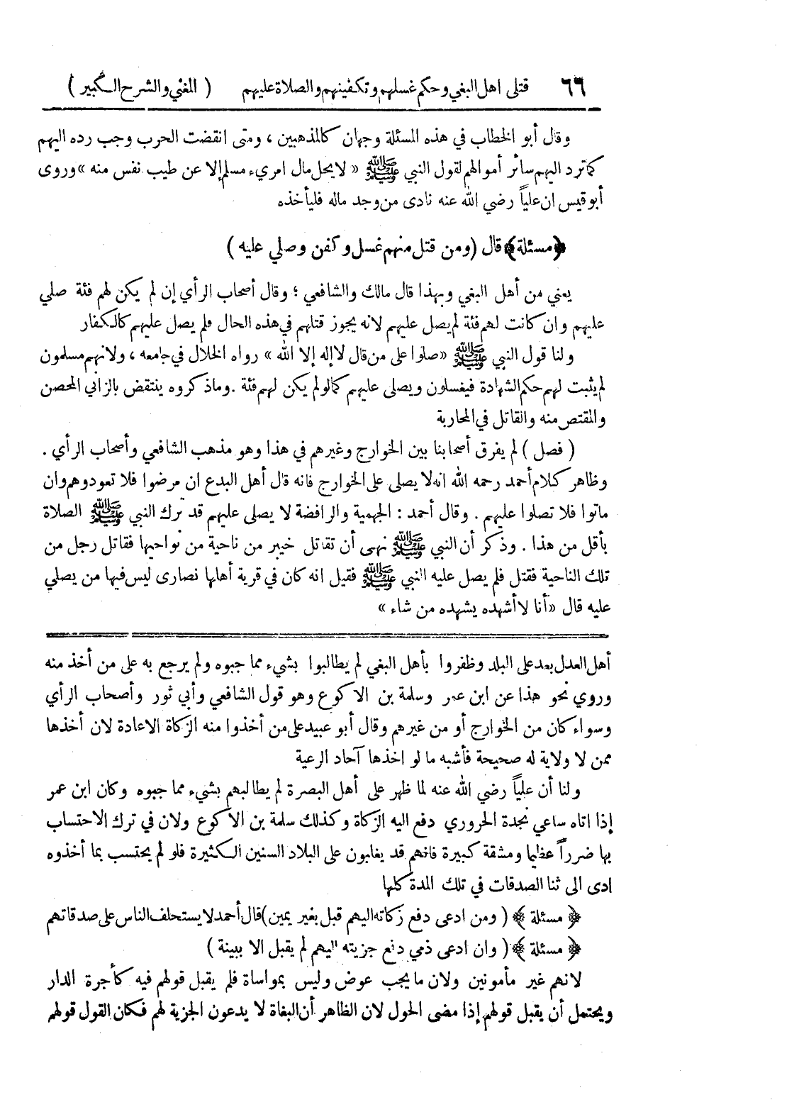 ممن لا ولاية له صحيحة فأشبه ما لو أخذها آحاد الرعية ولنا أن علياً رضي الله عنه لما ظهر على أهل البصرة لم يطالبهم بشئ مما جبوه وكان ابن عمر إذا أتاه ساعي نجدة الحروري دفع اليه الزكاة وكذلك سلمة بن الاكوع ولأن في ترك الاحتساب بها ضرراً عظيماً ومشقة كبيرة فانهم قد يغلبون على البلاد السنين الكثيرة فلو لم يحتسب بما أخذوه أدى إلى ثنا الصدقات في تلك المدة كلها (مسألة) (ومن ادعى دفع زكاته اليهم قبل بغير يمين) قال أحمد لا يستخلف الناس على صدقاتهم (مسألة) (وإن ادعى ذمي دفع جزيته اليهم لم يقبل الا ببينة) لأنهم غير مأمونين ولأن ما يجب عوض وليس بمواساة فلم يقبل قولهم فيه كأجرة الدار ويحتمل أن يقبل قولهم إذا مضى الحول لأن الظاهر أن البغاة لا يدعون الجزية لهم فكان القول قولهم