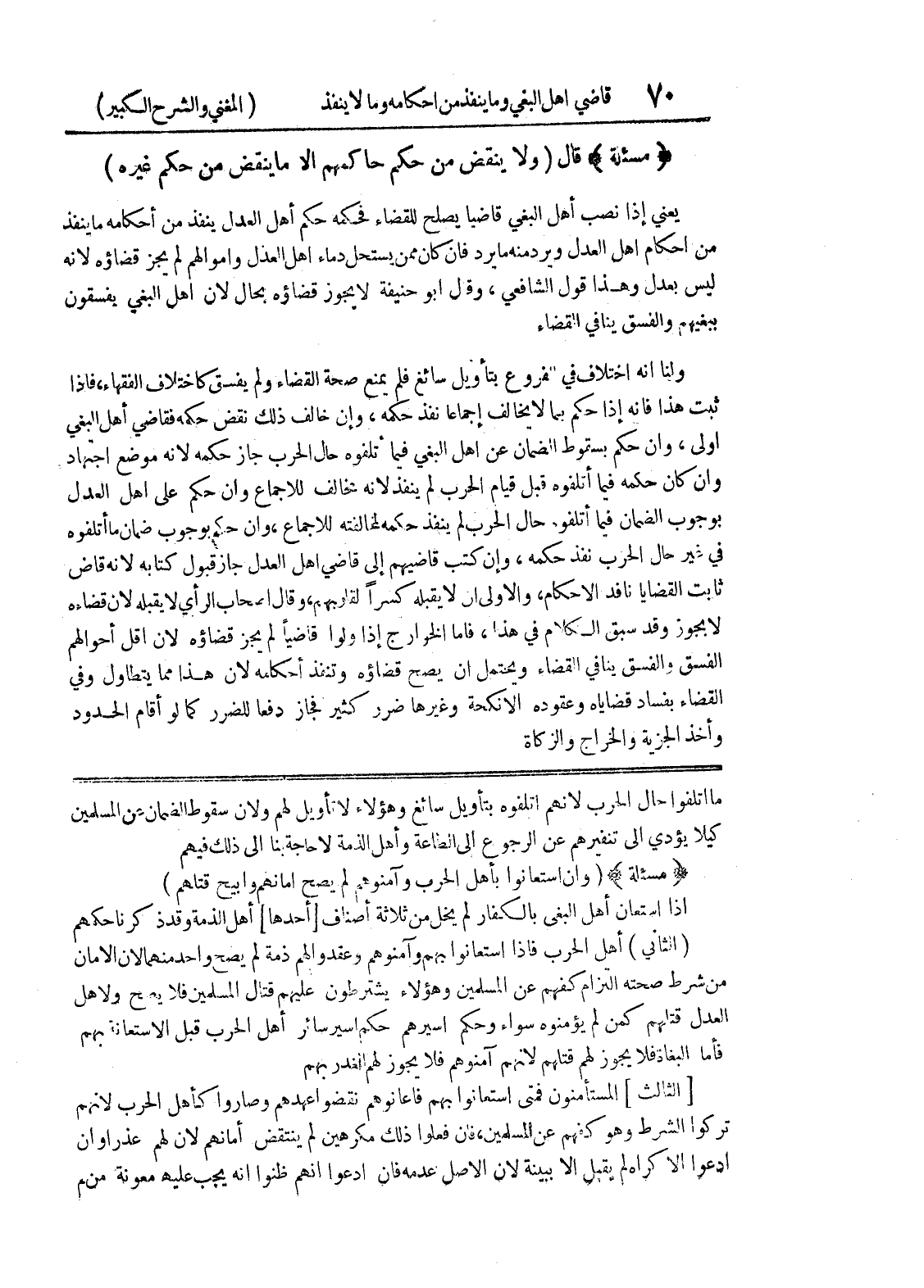 ما اتلفوا حال الحرب لأنهم اتلفوه بتأويل سائغ وهؤلاء لا تأويل لهم ولأن سقوط الضمان عن المسلمين كيلا يؤدي الى تنفيرهم عن الرجوع الى الطاعة وأهل الذمة لا حاجة بنا الى ذلك فيهم (مسألة) (وإن استعانوا بأهل الحرب وآمنوهم لم يصح امانهم وابيح قتلهم) إذا استعان أهل البغي بالكفار لم يخل من ثلاثة أصناف (أحدها) أهل الذمة وقد ذكرنا حكمهم (الثاني) أهل الحرب فاذا استعانو بهم وآمنوهم وعقدوا لهم ذمة لم يصح واحد منهما لأن الأمان من شرط صحته التزام كفهم عن المسلمين وهؤلاء يشترطون عليهم قتال المسلمين فلا يصح ولأهل العدل قتلهم كمن لم يؤمنوه سواء وحكم اسيرهم حكم اسير سائر أهل الحرب قبل الاستعانة بهم فأما البغاة فلا يجوز لهم قتلهم لأنهم آمنوهم فلا يجوز لهم الغدر بهم (الثالث) المستأمنون فمتى استعانوا بهم فأعانوهم نقضوا عهدهم وصاروا كأهل الحرب لأنهم تركوا الشرط وهو كفهم عن المسلمين، فان فعلوا ذلك مكرهين لم ينتقض أمانهم لان لهم عذر أو ان ادعو الاكراه لم يقبل إلا ببينة لأن الأصل عدمه فإن ادعوا أنهم ظنوا أنه يجب عليهم معونة من
