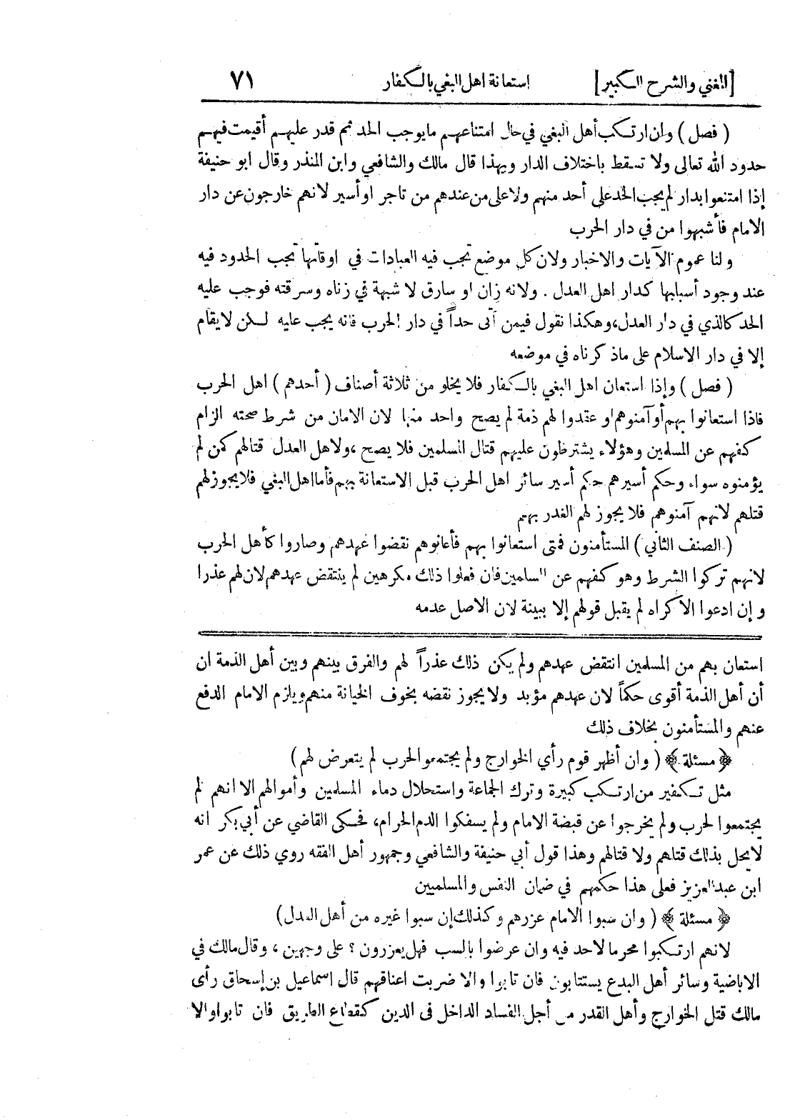 عنهم والمستأمنون بخلاف ذلك (مسألة) (وإن أظهر قوم رأي الخوارج ولم يجتمعوا لحرب لم يتعرض لهم) مثل تكفير من ارتكب كبيرة وترك الجماعة واستحلال دماء المسلمين وأموالهم إلا أنهم لم يجتمعوا لحرب ولم يخرجوا عن قبضة الامام ولم يسفكوا الدم الحرام، فحكى القاضي عن أبي بكر أنه لا يحل بذلك قتلهم ولا قتالهم وهذا قول أبي حنيفة والشافعي وجمهور أهل الفقه روى ذلك عن عمر ابن عبد العزيز فعى هذا حكمهم في ضمان النفس والمسلمين (مسألة) (وان سبوا الامام عزرهم وكذلك إن سبوا غيره من أهل العدل) لأنهم ارتكبوا محرماً لا حد فيه وان عرضوا بالسب فهل يعزرون؟ على وجهين، وقال مالك في الاباضية وسائر أهل البدع يستتابون فان تابوا وإلا ضربت أعناقهم قال اسماعيل بن إسحاق رأى مالك قتل الخوارج وأهل القدر من أجل الفساد الداخل في الدين كقطاع الطريق فان تابوا وإلا