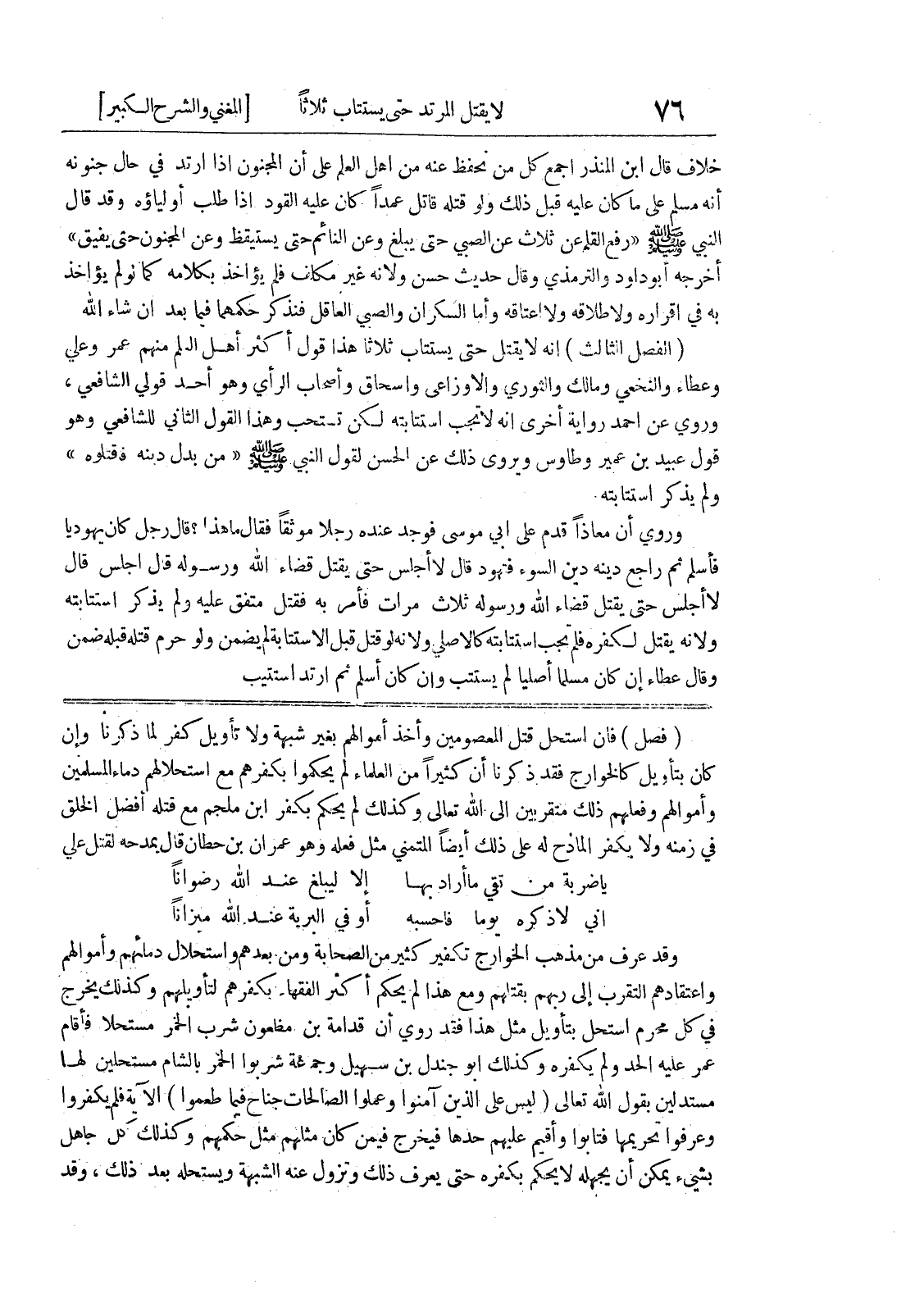 وأموالهم وفعلهم ذلك متقربين إلى الله تعالى وكذلك لم يحكم بكفر ابن ملجم مع قتله أفضل الخلق في زمنه ولا يكفر الماذح له على ذلك أيضاً المتمني مثل فعله وهو عمران بن حطان قال بمدحه لقتل علي يا ضربة من تقي ما أراد بها * إلا ليبلغ عند الله رضوانا اني لأذكره يوما فأحسبه * أوفى البرية عند الله ميزانا وقد عرف من مذهب الخوارج تكفير كثير من الصحابة ومن بعدهم واستحلال دمائهم وأموالهم واعتقادهم التقرب إلى ربهم بقتلهم ومع هذا لم يحكم أكثر الفقهاء بكفرهم لتأويلهم وكذلك يخرج في كل محرم استحل بتأويل مثل هذا فقد روي أن قدامة بن مظعون شرب الخمر مستحلاً فأقام عمر عليه الحد ولم يكفره وكذلك أبو جندل بن سهيل وجماعة شربوا الخمر بالشام مستحلين لها مستدلين بقول الله تعالى (ليس على الذين آمنوا وعملوا الصالحات جناح فيما طعموا) الآية فلم يكفروا وعرفوا تحريهما فتابوا وأقيم عليهم حدها فيخرج فيمن كان مثلهم مثل حكمهم وكذلك كل جاهل بشئ يمكن أن يجهله لا يحكم بكفره حتى يعرف ذلك وتزول عنه الشبهة ويستحله بعد ذلك، وقد