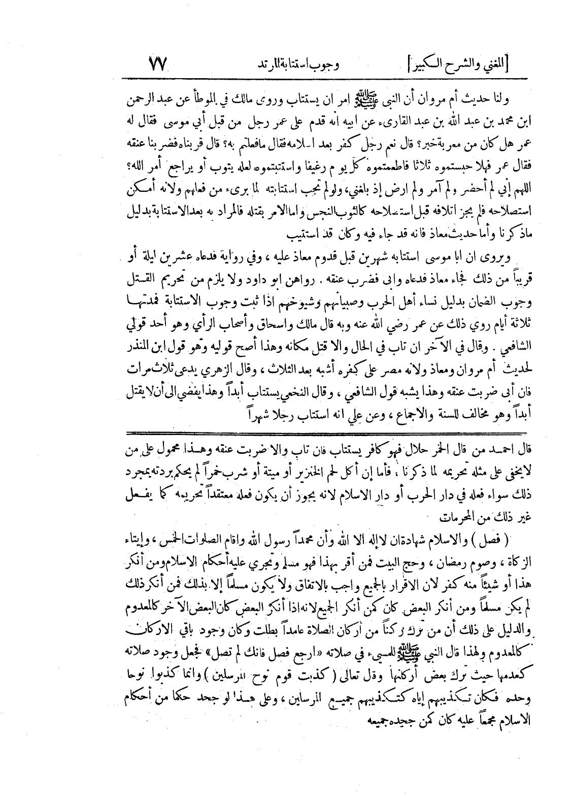 قال أحمد من قال الخمر حلال فهو كافر يستتاب فإن تاب والاضربت عنقه وهذا محمول على من لا يخفى على مثله تحريمه لما ذكرنا، فأما إن أكل لحم الخنزير أو ميتة أو شرب خمراً لم يحكم بردته بمجرد ذلك سواء فعله في دار الحرب أو دار الاسلام لأنه يجوز أن يكون فعله معتقداً تحريمه كما يفعل غير ذلك من المحرمات (فصل) والإسلام شهادة ان لا إله إلا الله وأن محمداً رسول الله وإقام الصلوات الخمس، وإيتاء الزكاة، وصوم رمضان، وحج البيت فمن أقر بهذا فهو مسلم وتجري عليه أحكام الاسلام ومن أنكر هذا أو شيئاً منه كفر لأن الإقرار بالجميع واجب بالاتفاق ولا يكون مسلماً إلا بذلك فمن أنكر ذلك لم يكن مسلماً ومن أنكر البعض كان كمن أنكر الجميع لأنه اذا أنكر البعض كان البعض الآخر كالمعدوم والدليل على ذلك أن من ترك ركناً من أركان الصلاة عامداً بطلت وكان وجود باقي الاركان كالمعدوم ولهذا قال النبي صلى الله عليه وسلم للمسئ في صلاته (ارجع فصل فانك لم تصل) فجعل وجود صلاته