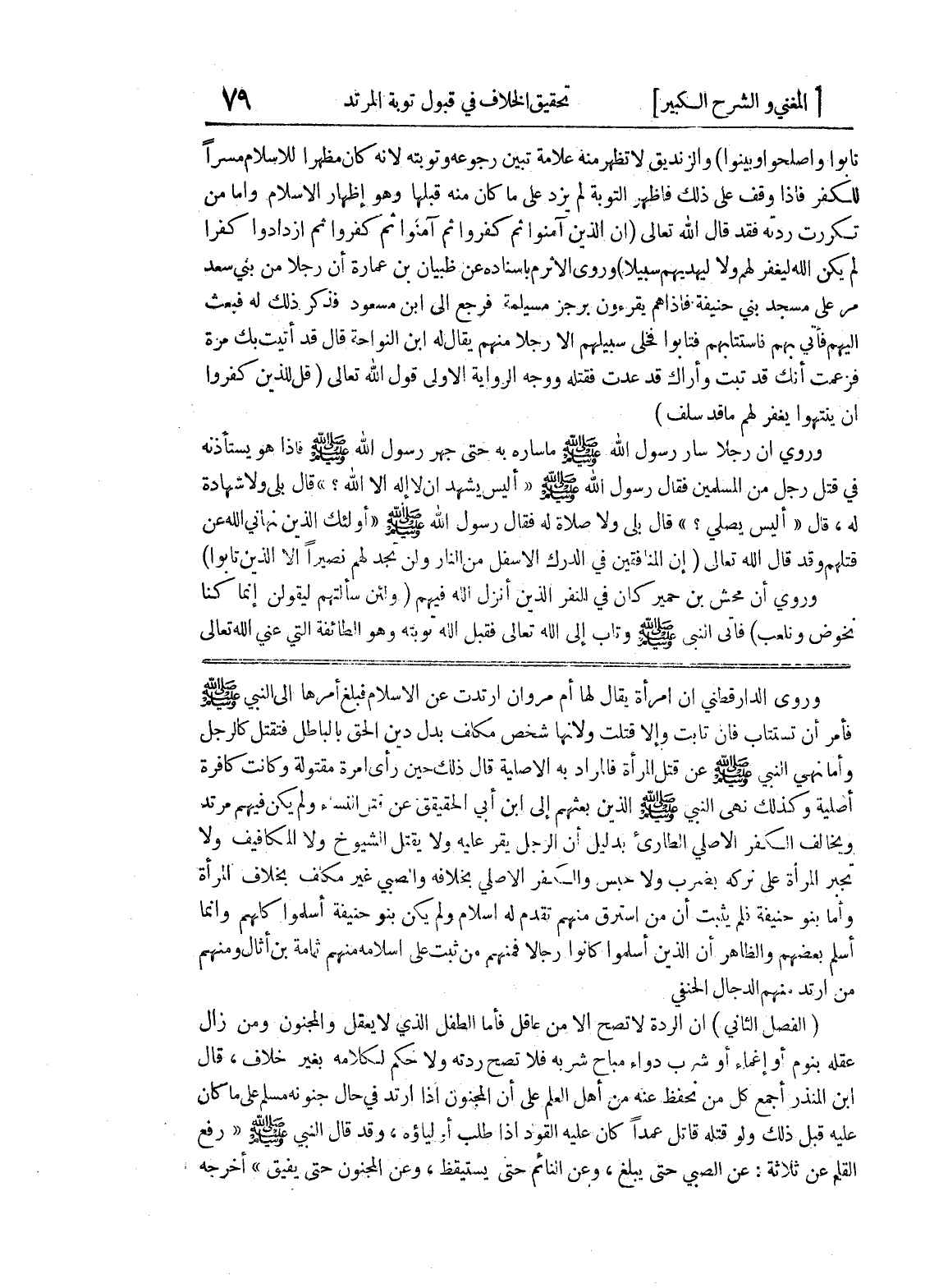 أصلية وكذلك نهى النبي صلى الله عليه وسلم الذين بعثهم إلى ابن أبي الحقيقق عن قتل النساء ولم يكن فيهم مرتد ويخالف الكفر الاصلي الطارئ بدليل أن الرجل يقر عليه ولا يقتل الشيوخ ولا المكافيف ولا تجبر المرأة على تركه بضرب ولا حبس والكفر الاصلي بخلافه والصبي غير مكلف بخلاف المرأة وأما بنو حنيفة فلم يثبت أن من استرق منهم تقدم له إسلام ولم يكن بنو حنيفة أسلموا كلهم وإنما أسلم بعضهم والظاهر أن الذين أسلموا كانوا رجالاً فمنهم من ثبت على إسلامه منهم ثمامة بن أثال ومنهم من ارتد منهم الدجال الحنفي (الفصل الثاني) إن الردة لا تصح إلا من عاقل فأما الطفل الذي لا يعقل والمجنون ومن زال عقله بنوم أو إغماء أو شرب دواء مباح شربه فلا تصح ردته ولا حكم لكلامه بغير خلاف، قال ابن لمنذر أجمع كل من نحفظ عنه من أهل العلم على ان المجنون إذا ارتد في حال جنونه مسلم على ما كان عليه قبل ذلك ولو قتله قاتل عمداً كان عليه القود اذا طلب أولياؤه، وقد قال النبي صلى الله عليه وسلم (رفع القلم عن ثلاثة: عن الصبي حتى يبلغ، وعن النائم حتى يستيقظ، وعن المجنون حتى يفيق) أخرجه