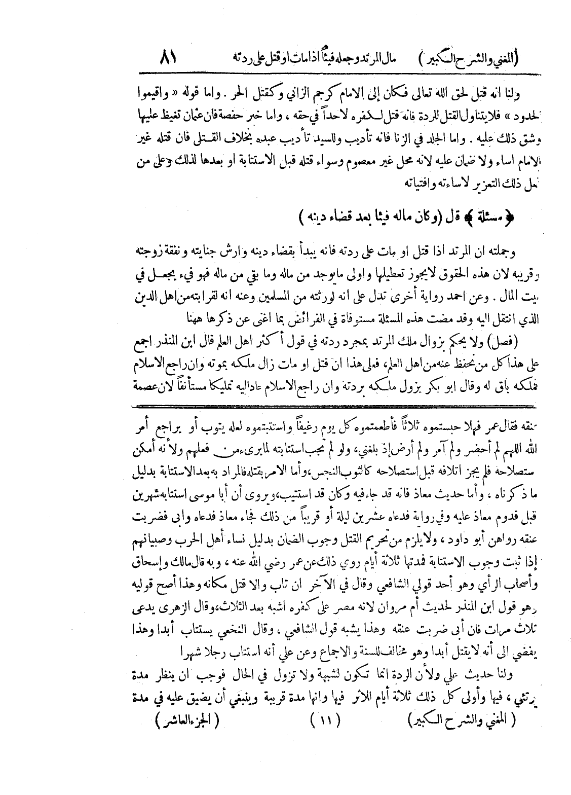 عنقه فقال عمر فهلا حبستموه ثلاثاً فأطعمتموه كل يوم رغيفاً واستتبتموه لعله يتوب أو يراجع أمر الله اللهم لم أحضر ولم آمر ولم أرض إذ بلغني، ولو لم تجب استتابته لما برئ من فعلهم ولأنه أمكن ستصلاحه فلم يجز إتلافه قبل استصلاحه كالثوب النجس، وأما الأمر بقتله فالمراد به بعد الاستتابة بدليل ما ذكرناه، وأما حديث معاذ فإنه قد جاء فيه وكان قد استتيب، ويروى أن أبا موسى استتابه شهرين قبل قدوم معاذ عليه وفي رواية فدعاه عشرين ليلة أو قريباً من ذلك فجاء معاذ فدعاه وأبى فضربت عنقه رواهن أبو داود، ولا يلزم من تحريم القتل وجوب الضمان بدليل نساء أهل الحرب وصبيانهم إذا ثبت وجوب الاستتابة فمدتها ثلاثة أيام روى ذلك عن عمر رضي الله عنه، وبه قال مالك واسحاق وأصحاب الرأي وهو أحد قولي الشافعي وقال في الآخر ان تاب والاقتل مكانه وهذا أصح قوليه وهو قول ابن المنذر لحديث أم مروان لأنه مصر على كفره اشبه بعد الثلاث، وقال الزهري يدعى ثلاث مرات فان أبى ضربت عنقه وهذا يشبه قول الشافعي، وقال النخعي يستتاب أبدا وهذا يفضي إلى أنه لا يقتل أبدا وهو مخالف للسنة والاجماع وعن علي أنه استتاب رجلاً شهراً ولنا حديث علي ولأن الردة إنما تكون لشبهة ولا تزول في الحال فوجب أن ينظر مدة؟ رتئي، فيها وأولى كل ذلك ثلاثة أيام للاثر فيها وانها مدة قريبة وينبغي أن يضيق عليه في مدة