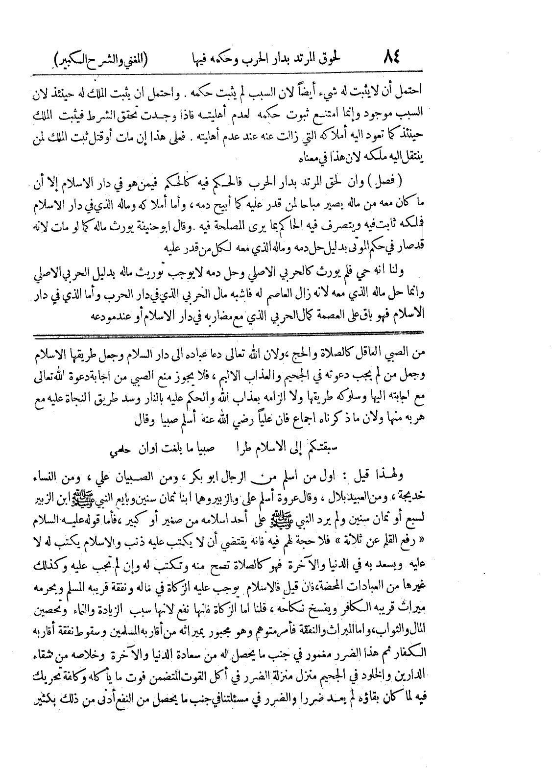 من الصبي العاقل كالصلاة والحج، ولأن الله تعالى دعا عباده الى دار السلام وجعل طريقها الاسلام وجعل من لم يجب دعوته في الجحيم والعذاب الاليم، فلا يجوز منع الصبي من إجابة دعوة الله تعالى مع إجابته اليها وسلوكه طريقها ولا الزامه بعذاب الله والحكم عليه بالنار وسد طريق النجاة عليه مع هربه منها ولأن ما ذكرناه إجماع فان علياً رضي الله عنه أسلم صبياً وقال سبقتكم إلى الاسلام طرا صبيا ما بغلت اوان حلمي ولهذا قيل: أول من أسلم من الرجال أبو بكر، ومن الصبيان علي، ومن النساء خديجة، ومن العبيد بلال، وقال عروة أسلم علي والزبير وهما ابنا ثمان سنين وبايع النبي صلى الله عليه وسلم ابن الزبير لسبع او ثمان سنين ولم يرد النبي صلى الله عليه وسلم على أحد اسلامه من صغير أو كبير، فأما قوله عليه السلام (رفع القلم عن ثلاثة) فلا حجة لهم فيه فانه يقتضي أن لا يكتب عليه ذنب والاسلام يكتب له لا عليه ويسعد به في الدنيا والآخرة فهو كالصلاة تصح منه وتكتب له وإن لم تجب عليه وكذلك غيرها من العبادات المحضة، فان قيل فالاسلام يوجب عليه الزكاة في ماله ونفقة قريبه المسلم ويحرمه ميراث قريبه الكفار ويفسخ نكاحه، قلنا أما الزكاة فإنها نفع لأنها سبب الزيادة والنماء وتحصين المال والثواب، وأما الميراث والنفقة فأمر متوهم وهو مجبور بميراثه من أقاربه المسلمين وسقوط نفقة أقاربه الكفار ثم هذا الضرر مغمور في جنب ما يحصل له من سعادة الدنيا والآخرة وخلاصه من شقاء الدارين والخلود في الجحيم منزل منزلة الضرر في أكل القوت المتضمن فوت ما يأكله وكلفة تحريك فيه لما كان بقاؤه لم يعد ضررا والضرر في مسئلتنا في جنب ما يحصل من النفع أدنى من ذلك بكثير