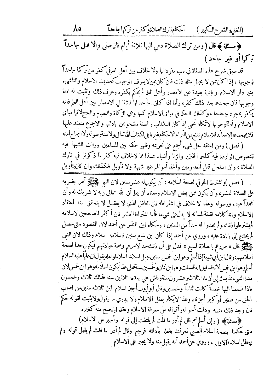 على الصلاة لعشر، وأن يكون ممن يعقل الاسلام ومعناه أن يعلم أن الله تعالى ربه لا شريك له وأن محمداً عبده ورسوله وهذا لا خلاف في اشتراطه فان الطفل الذي لا يعقل لا يتحقق منه اعتقاد الإسلام وإنما كلامه لقلقة بلسانه لا يدل على شئ، فأما اشتراط العشر فان أكثر المصححين لإسلامه لم يشترطوا ذلك ولم يحدوا له حداً من السنين، وحكاه ابن المنذر عن أحمد لأن المقصود متى حصل لم يحتج إلى زيادة عليه، وروى عن أحمد إذا كان ابن سبع سنين فاسلامه إسلام وذلك لأن النبي صلى الله عليه وسلم قال (مروهم بالصلاة لسبع) فدل على أن ذلك حد لامرهم وصحة عبادتهم فيكون حداً لصحة إسلامهم، وقال ابن أبي شيبة إذا أسلم وهو ابن خمس سنين جعل إسلامه إسلاماً ولعله يقول أن علياً عليه السلام أسلم وهو ابن خمس لأنه قد قيل انه قد مات وهو ابن ثمان وخمسين سنة فعلى هذا يكون اسلامه وهو ابن خمس لأن مدة النبي منذ بعث إلى أن مات ثلاث وعشرون سنة وعاش علي بعده ثلاثين سنة فذلك ثلاث وخمسون فاذا ضممنا اليها خمساً كانت ثمانياً وخمسين وقال أبو أيوب أجيز اسلام ابن ثلاث سنين من أصاب الحق من صغير أو كبير أجزناه وهذا لا يكاد يعقل الاسلام ولا يدري ما يقول ولا يثبت لقوله حكم فان وجد ذلك منه ودلت أحواله وأقواله على معرفة الاسلام وعقله إياه صح منه كغيره (مسألة) (وإن أسلم ثم قال لم أدر ما قلت لم يلتفت إلى قوله وأجبر على الاسلام) متى حكمنا بصحة إسلام الصبي لمعرفتنا بفعله بأدلته فرجع وقال لم أدر ما قلت لم يقبل قوله ولم يبطل إسلامه الاول، وروى عن أحمد أنه يقبل منه ولا يجبر على الاسلام