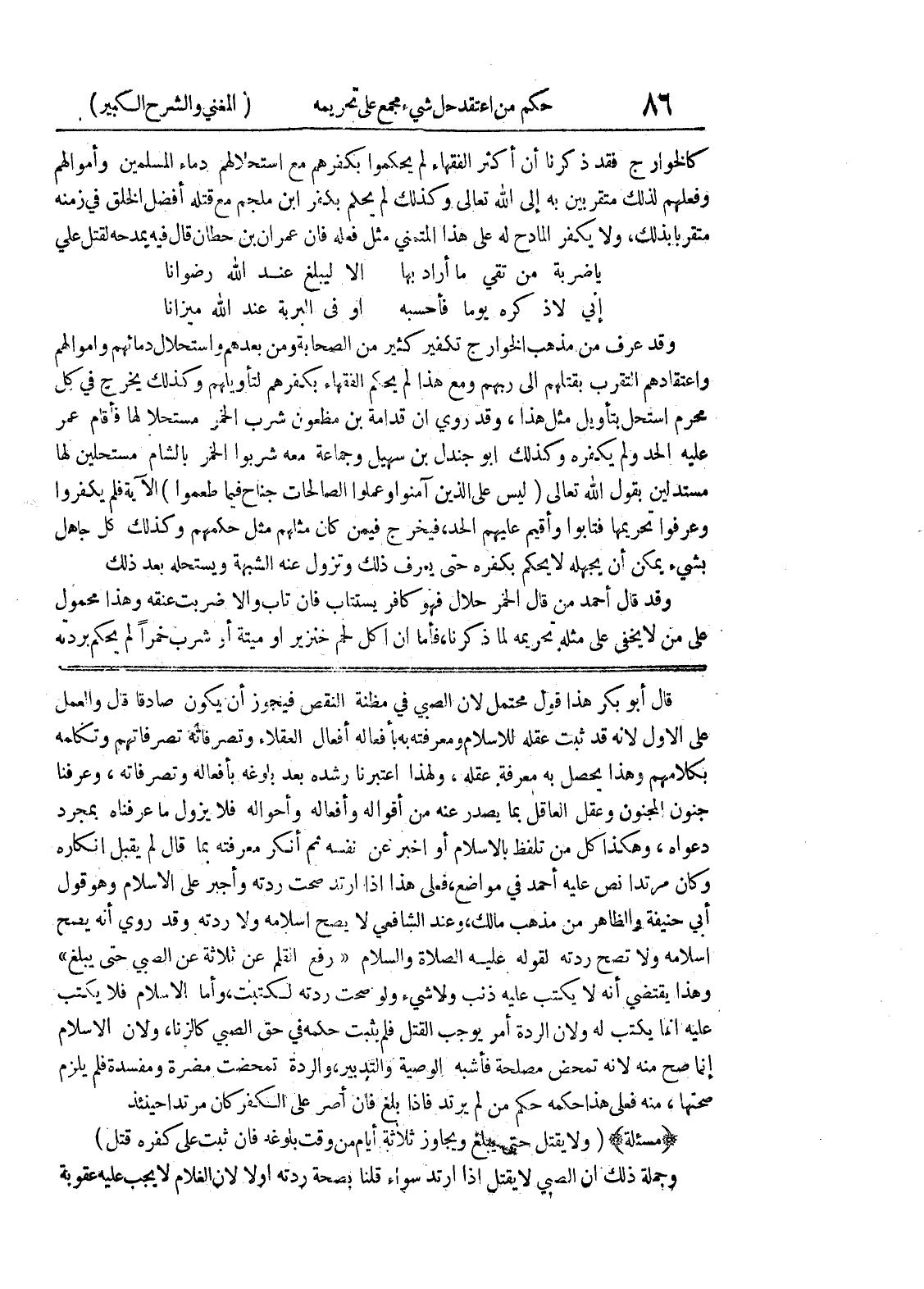 قال أبو بكر هذا قول محتمل لأن الصبي في مظنة النقص فيجوز أن يكون صادقاً قال والعمل على الأول لأنه قد ثبت عقله للاسلام ومعرفته به بأفعاله أفعال العقلاء وتصرفاته تصرفاتهم وتكلمه بكلامهم وهذا يحصل به معرفة عقله، ولهذا اعتبرنا رشده بعد بلوغه بأفعاله وتصرفاته، وعرفنا جنون المجنون وعقل العاقل بما يصدر عنه من أقواله وأفعاله وأحواله فلا يزول ما عرفناه بمجرد دعواه وهكذا كل من تلفظ بالاسلام أو اخبر عن نفسه ثم أنكر معرفته بما قال لم يقبل إنكاره وكان مرتدا نص عليه أحمد في مواضع، فعلى هذا إذا ارتد صحت ردته وأجبر على الاسلام وهو قول