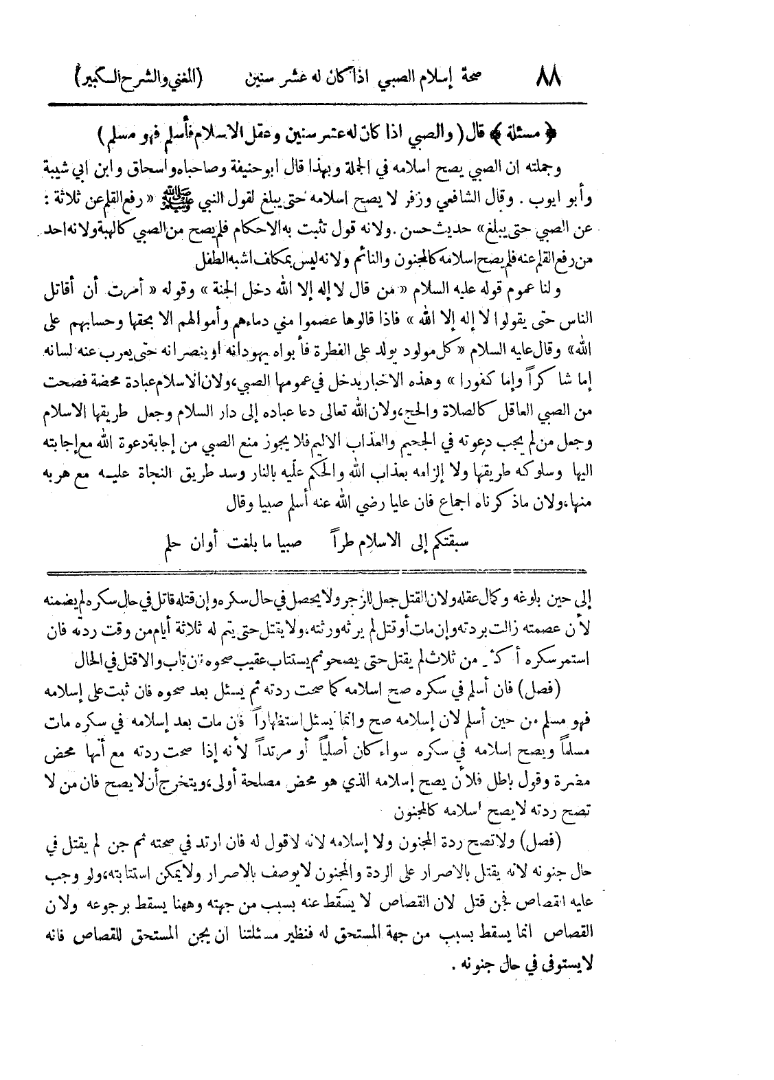 إلى حين بلوغه وكمال عقله ولأن القتل جعل للزجر ولا يحصل في حال سكره وإن قتله قاتل في حال سكره لم يضمنه لأن عصمته زالت بردته وإن مات أو قتل لم يرثه ورثته، ولا يقتل حتى يتم له ثلاثة أيام من وقت ردته فان استمر سكره أكثر من ثلاث لم يقتل حتى يصحو ثم يستتاب عقيب صحوه فإن تاب وإلا قتل في الحال (فصل) فان أسلم في سكره صح إسلامه كما صحت ردته ثم يسئل بعد صحوه فان ثبت على إسلامه فهو مسلم من حين أسلم لأن إسلامه صح وإنما يسئل استظهاراً فان مات بعد إسلامه في سكره مات مسلماً ويصح إسلامه في سكره سواء كان أصلياً أو مرتداً لأنه إذا صحت ردته مع أنها محض مضرة وقول باطل فلأن يصح إسلامه الذي هو محض مصلحة أولى، ويتخرج أن لا يصح فان من لا تصح ردته لا يصح اسلامه كالمجنون (فصل) ولا تصح ردة المجنون ولا إسلامه لأنه لا قول له فان ارتد في صحته ثم جن لم يقتل في حال جنونه لأنه يقتل بالاصرار على الردة والمجنون لا يوصف بالاصرار ولا يمكن استتابته، ولو وجب عليه القصاص فجن قتل لأن القصاص لا يسقط عنه بسبب من جهته وههنا يسقط برجوعه ولأن القصاص إنما يسقط بسبب من جهة المستحق له فنظير مسئلتنا أن يجن المستحق للقصاص فانه لا يستوفى في حال جنونه.