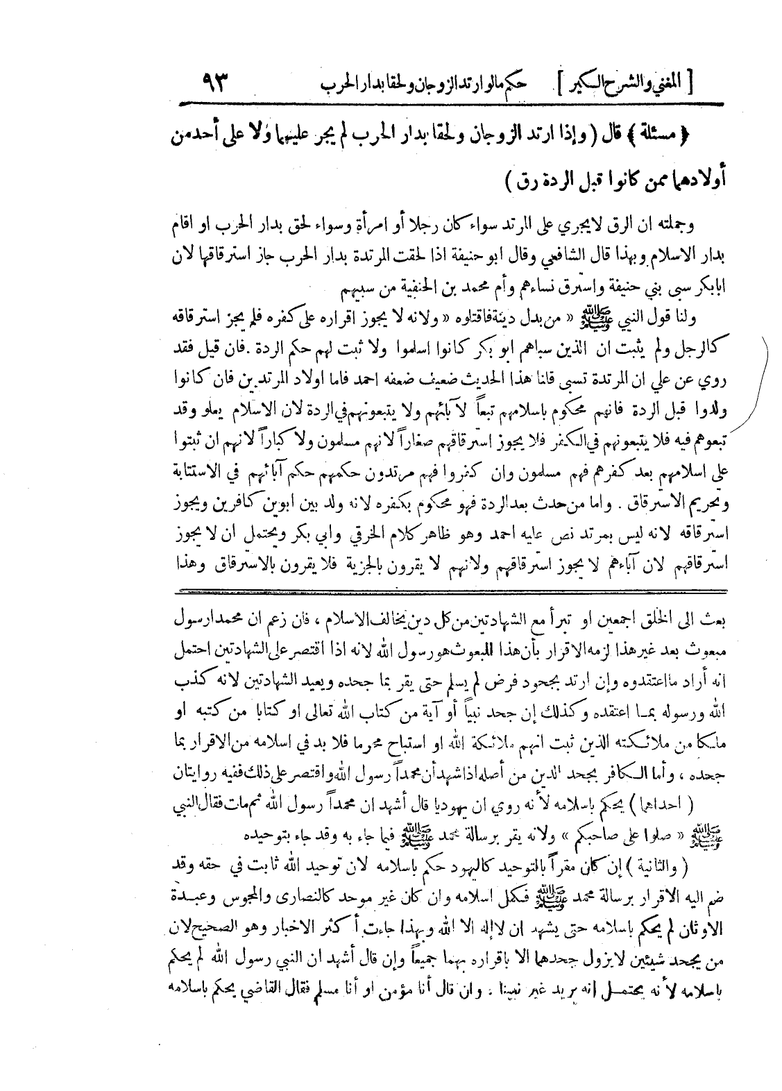 بعث إلى الخلق أجمعين أو تبرأ مع الشهادتين من كل دين يخالف الاسلام، فإن زعم أن محمداً رسول مبعوث بعد غير هذا لزمه الاقرار بأن هذا المبعوث هو رسول الله لأنه إذا اقتصر على الشهادتين احتمل انه أراد ما اعتقدوه وإن ارتد بجحود فرض لم يسلم حتى يقر بما جحده ويعيد الشهادتين لأنه كذب الله ورسوله بما اعتقده وكذلك إن جحد نبياً أو آية من كتاب الله تعالى أو كتاباً من كتبه أو ملكاً من ملائكته الذين ثبت أنهم ملائكة الله أو استباح محرماً فلابد في إسلامه من الإقرار بما