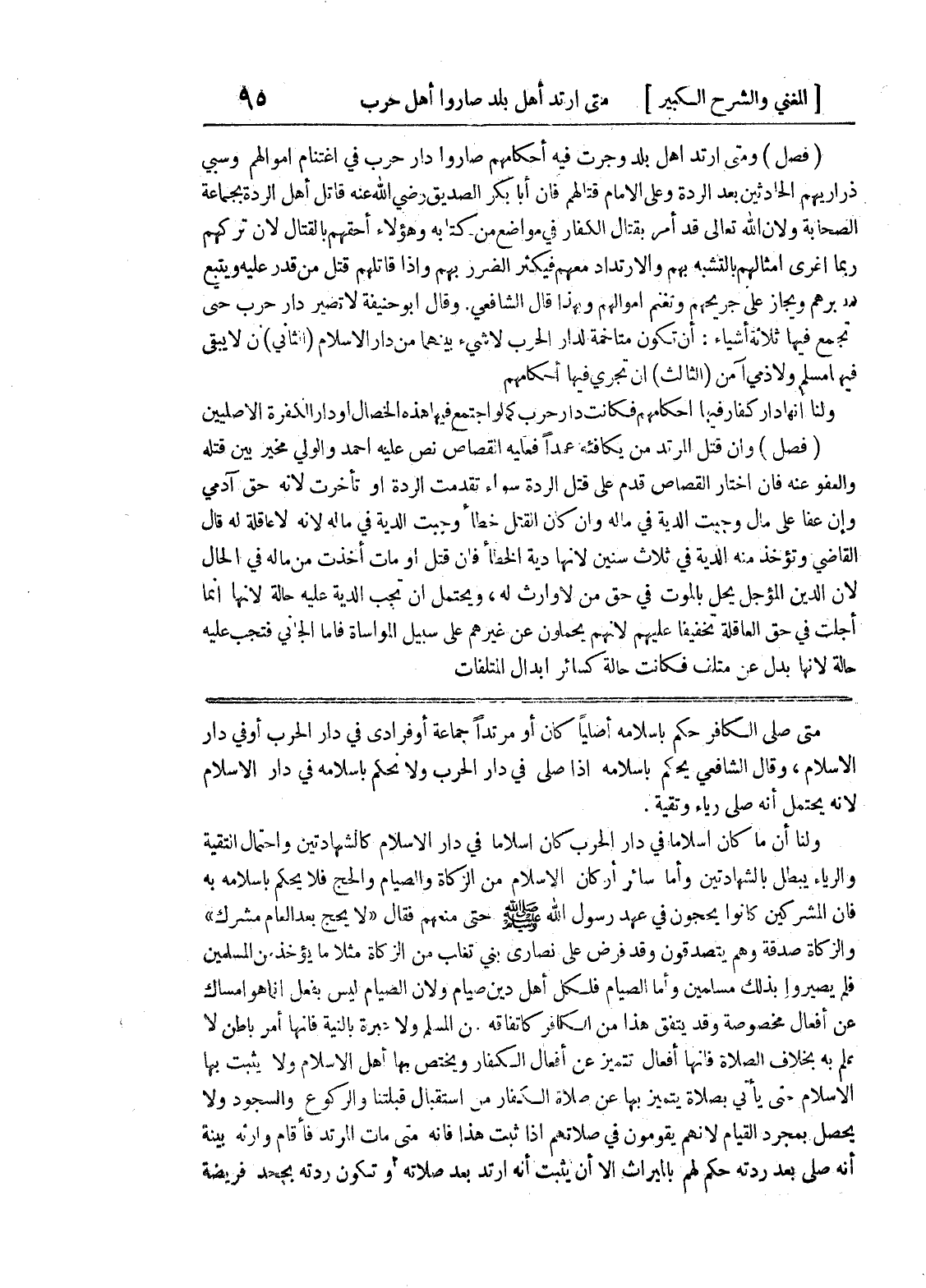 ولنا أن ما كان اسلاماً في دار الحرب كان اسلاما في دار الإسلام كالشهادتين واحتمال التقية والرياء يبطل بالشهادتين وأما سائر أركان الإسلام من الزكاة والصيام والحج فلا يحكم باسلامه به فان المشركين كانوا يحجون في عهد رسول الله صلى الله عليه وسلم حتى منعهم فقال (لا يحج بعد العام مشرك) والزكاة صدقة وهم يتصدقون وقد فرض على نصارى بني تغلب من الزكاة مثلا ما يؤخذ من المسلمين فلم يصيروا بذلك مسلمين وأما الصيام فلكل أهل دين صيام ولأن الصيام ليس بفعل إنما هو امساك عن أفعال مخصوصة وقد يتفق هذا من الكافر كاتفاقه من المسلم ولا عبرة بالنية فإنها أمر باطن لا علم به بخلاف الصلاة فإنها أفعال تتميز عن أفعال الكفار ويختص بها أهل الاسلام ولا يثبت بها الاسلام حتى يأتي بصلاة يتميز بها عن صلاة الكفار من استقبال قبلتنا والركوع والسجود ولا يحصل بمجرد القيام لأنهم يقومون في صلاتهم إذا ثبت هذا فإنه متى مات المرتد فأقام وارثه بينة أنه صلى بعد ردته حكم لهم بالميراث إلا أن يثبت أنه ارتد بعد صلاته أو تكون ردته بجحد فريضة