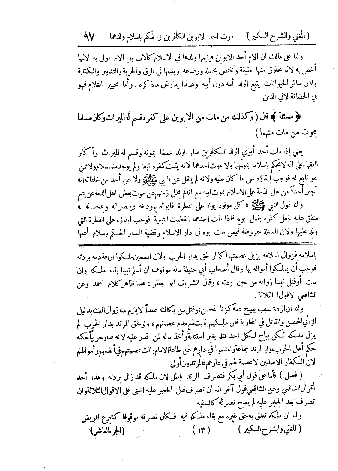 باسلامه فزوال اسلامه يزيل عصمتهما كما لو لحق بدار الحرب ولأن المسلمين ملكوا إراقة دمه بردته فوجب أن يملكوا أمواله بها وقال أصحاب أبي حنيفة ماله موقوف إن أسلم تبينا بقاء ملكه وإن مات أو قتل تبينا زواله من حين ردته، وقال الشريف أبو جعفر: هذا ظاهر كلام أحمد وعن الشافعي الاقول ا؟ (الأقوال) الثلاثة ولنا ان الردة سبب يبيح دمه كزنا المحصن، وقتل من يكافئه عمداً لا يلزم منه زوال الملك بدليل الزاني المحصن والقاتل في المحاربة فان ملكهم ثابت مع عدم عصمتهم، ولو لحق المرتد بدار الحرب لم يزل ملكه لكن يباح لكل احد قتله بغير استتابة وأخذ ماله لمن قدر عليه لأنه صار حربياً حكمه حكم أهل الحرب، ولو ارتد جماعة وامتنعوا في دارهم عن طاعة الامام زالت عصمتهم في أنفسهم وأموالهم لأن الكفار الاصليين لا عصمة لهم في دارهم فالمرتدون أولى (فصل) فأما على قول أبي بكر فتصرف المرتد باطل لانه ملكه قد زال بردته وهذ أحد أقوال الشافعي وعن الشافعي قول آخر إنه ان تصرف قبل الحجر عليه انبنى على الاقوال الثلاثة وان تصرف بعد الحجر عليه لم يصح تصرفه كالسفيه ولنا ان ملكه تعلق به حق غيره مع بقاء ملكه فيه فكان تصرفه موقوفا كتبرع المريض