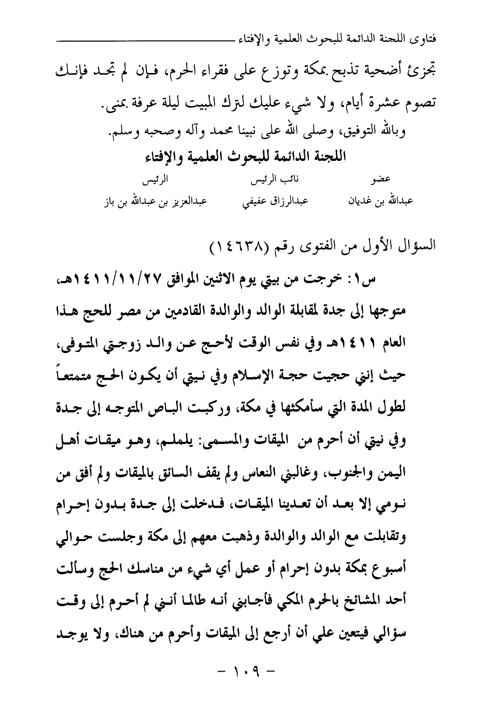 س1: خرجت من بيتي يوم الاثنين الموافق 27\11\1411هـ متوجها إلى جدة لمقابلة الوالد والوالدة القادمين من مصر للحج هذا العام 1411هـ، وفي نفس الوقت لأحج عن والد زوجتي المتوفى، حيث إنني حججت حجة الإسلام وفي نيتي أن يكون الحج متمتعا لطول المدة التي سأمكثها في مكة، وركبت الباص المتوجه إلى جدة، وفي نيتي أن أحرم من الميقات والمسمى: يلملم، وهو ميقات أهل اليمن والجنوب، وغالبني النعاس ولم يقف السائق بالميقات ولم أفق من نومي إلا بعد أن تعدينا الميقات، فدخلت إلى جدة بدون إحرام وتقابلت مع الوالد والوالدة، وذهبت معهم إلى مكة وجلست حوالي أسبوع بمكة بدون إحرام أو عمل أي شيء من مناسك الحج، وسألت أحد المشائخ بالحرم المكي، فأجابني أنه طالما أنني لم أحرم إلى وقت سؤالي فيتعين علي أن أرجع إلى الميقات وأحرم من هناك، ولا يوجد