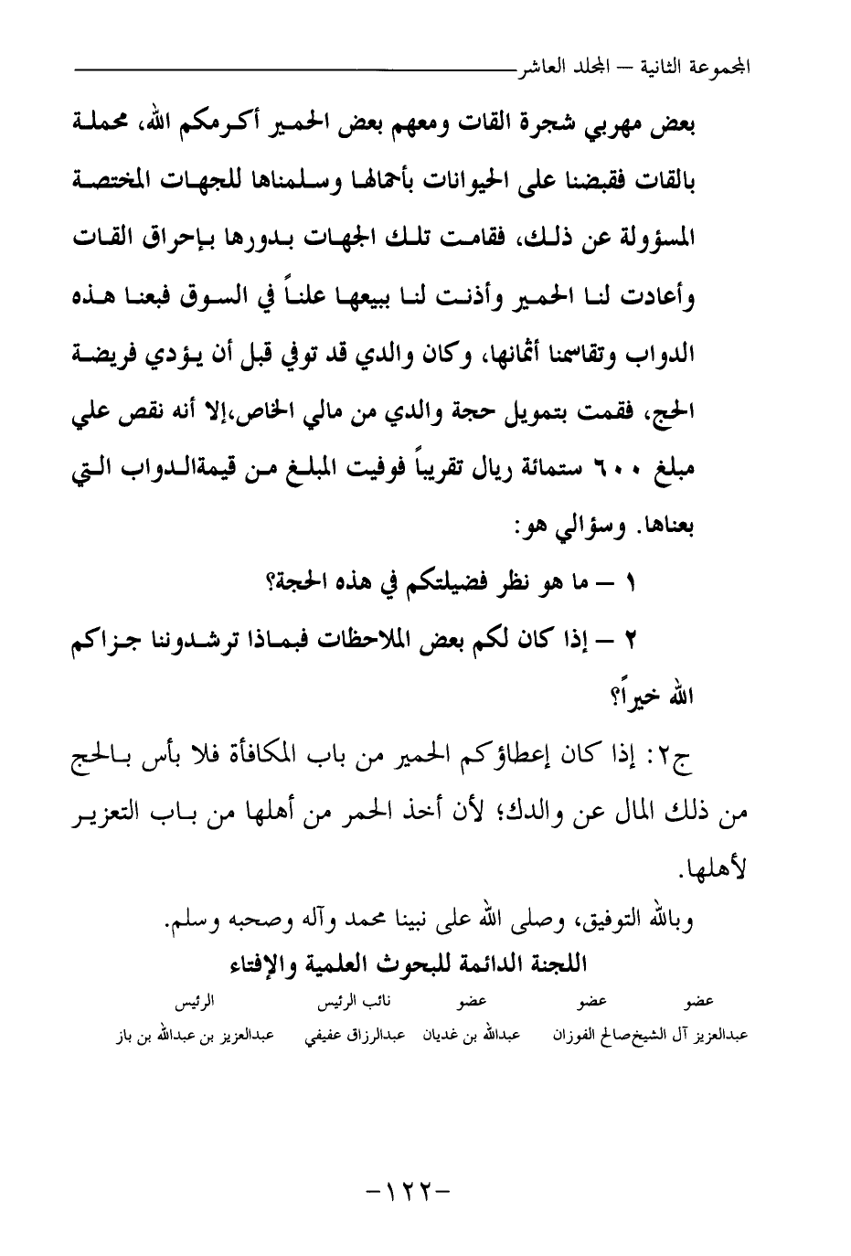 بعض مهربي شجرة القات ومعهم بعض الحمير أكرمكم الله، محملة بالقات فقبضنا على الحيوانات بأحمالها، وسلمناها للجهات المختصة المسئولة عن ذلك، فقامت تلك الجهات بدورها بإحراق القات، وأعادت لنا الحمير، وأذنت لنا ببيعها علنا في السوق، فبعنا هذه الدواب وتقاسمنا أثمانها، وكان والدي قد توفي قبل أن يؤدي فريضة الحج، فقمت بتمويل حجة والدي من مالي الخاص، إلا أنه نقص على مبلغ 600 ستمائة ريال تقريبا، فوفيت المبلغ من قيمة الدواب التي بعناها. وسؤالي هو: