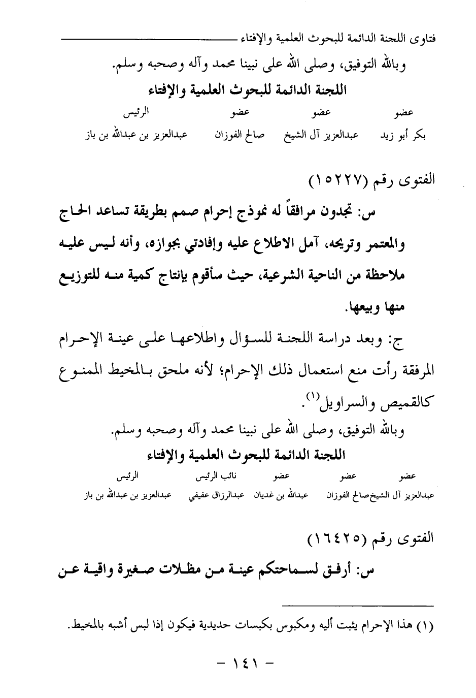 ج: وبعد دراسة اللجنة للسؤال واطلاعها على عينة الإحرام المرفقة رأت منع استعمال ذلك الإحرام؛ لأنه ملحق بالمخيط الممنوع كالقميص والسراويل (¬1)