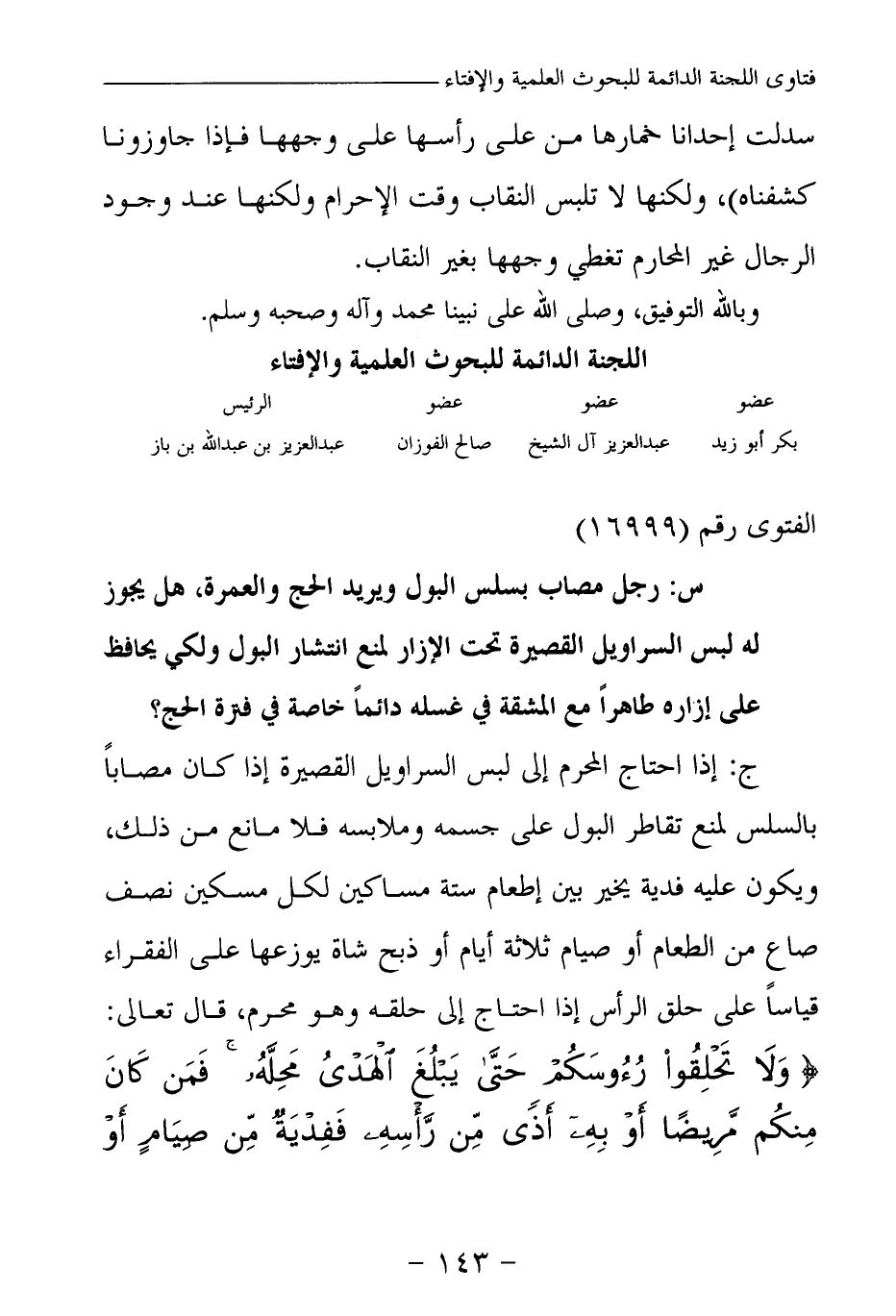 ج: إذا احتاج المحرم إلى لبس السراويل القصيرة إذا كان مصابا بالسلس لمنع تقاطر البول على جسمه وملابسه فلا مانع من ذلك، ويكون عليه فدية يخير بين إطعام ستة مساكين لكل مسكين نصف صاع من الطعام أو صيام ثلاثة أيام أو ذبح شاة يوزعها على الفقراء قياسا على حلق الرأس إذا احتاج إلى حلقه وهو محرم، قال تعالى: {وَلَا تَحْلِقُوا رُءُوسَكُمْ حَتَّى يَبْلُغَ الْهَدْيُ مَحِلَّهُ فَمَنْ كَانَ مِنْكُمْ مَرِيضًا أَوْ بِهِ أَذًى مِنْ رَأْسِهِ فَفِدْيَةٌ مِنْ صِيَامٍ أَوْ صَدَقَةٍ أَوْ نُسُكٍ} (¬1) ،
