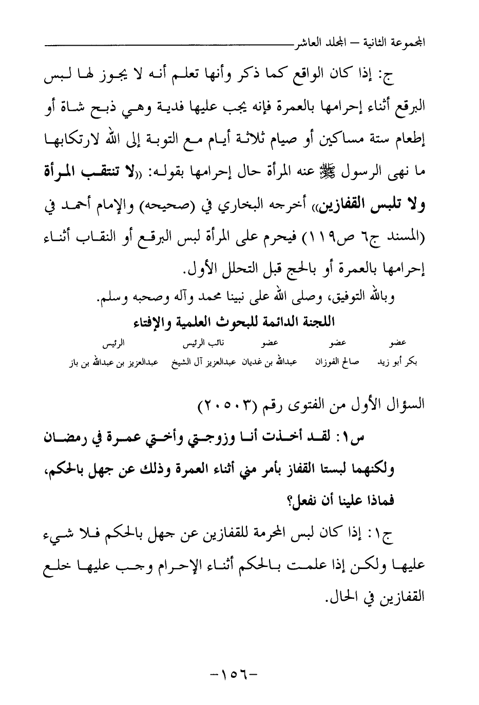 ج: إذا كان الواقع كما ذكر وأنها تعلم أنه لا يجوز لها لبس البرقع أثناء إحرامها بالعمرة فإنه يجب عليها فدية وهي: ذبح شاة، أو إطعام ستة مساكين، أو صيام ثلاثة أيام، مع التوبة إلى الله لارتكابها ما نهى الرسول -صلى الله عليه وسلم- عنه المرأة حال إحرامها بقوله: «لا تنتقب المرأة ولا تلبس القفازين (¬1) » . أخرجه البخاري في «صحيحه» ، والإمام أحمد في «المسند ج6 ص119» . فيحرم على المرأة لبس البرقع أو النقاب أثناء إحرامها بالعمرة أو بالحج قبل التحلل الأول.