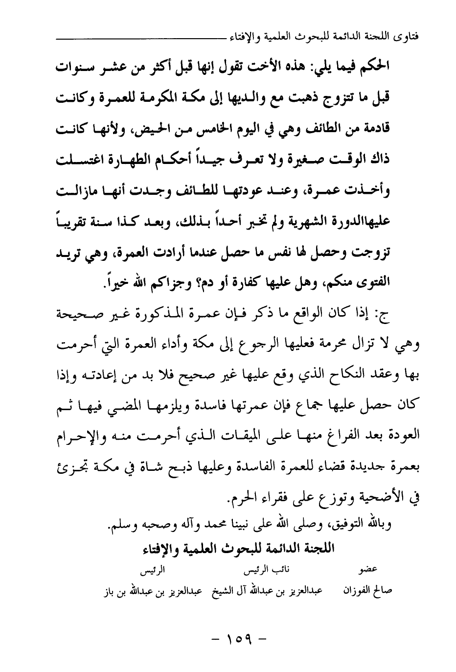 الحكم فيما يلي: هذه الأخت تقول: إنها قبل أكثر من عشر سنوات قبل ما تتزوج ذهبت مع والديها إلى مكة المكرمة للعمرة، وكانت قادمة من الطائف وهي في اليوم الخامس من الحيض، ولأنها كانت ذاك الوقت صغيرة ولا تعرف جيدا أحكام الطهارة اغتسلت وأخذت عمرة، وعند عودتها للطائف وجدت أنها ما زالت عليها الدورة الشهرية ولم تخبر أحدا بذلك، وبعد كذا سنة تقريبا تزوجت، وحصل لها نفس ما حصل عندما أرادت العمرة، وهي تريد الفتوى منكم، وهل عليها كفارة أو دم؟ وجزاكم الله خيرا.
