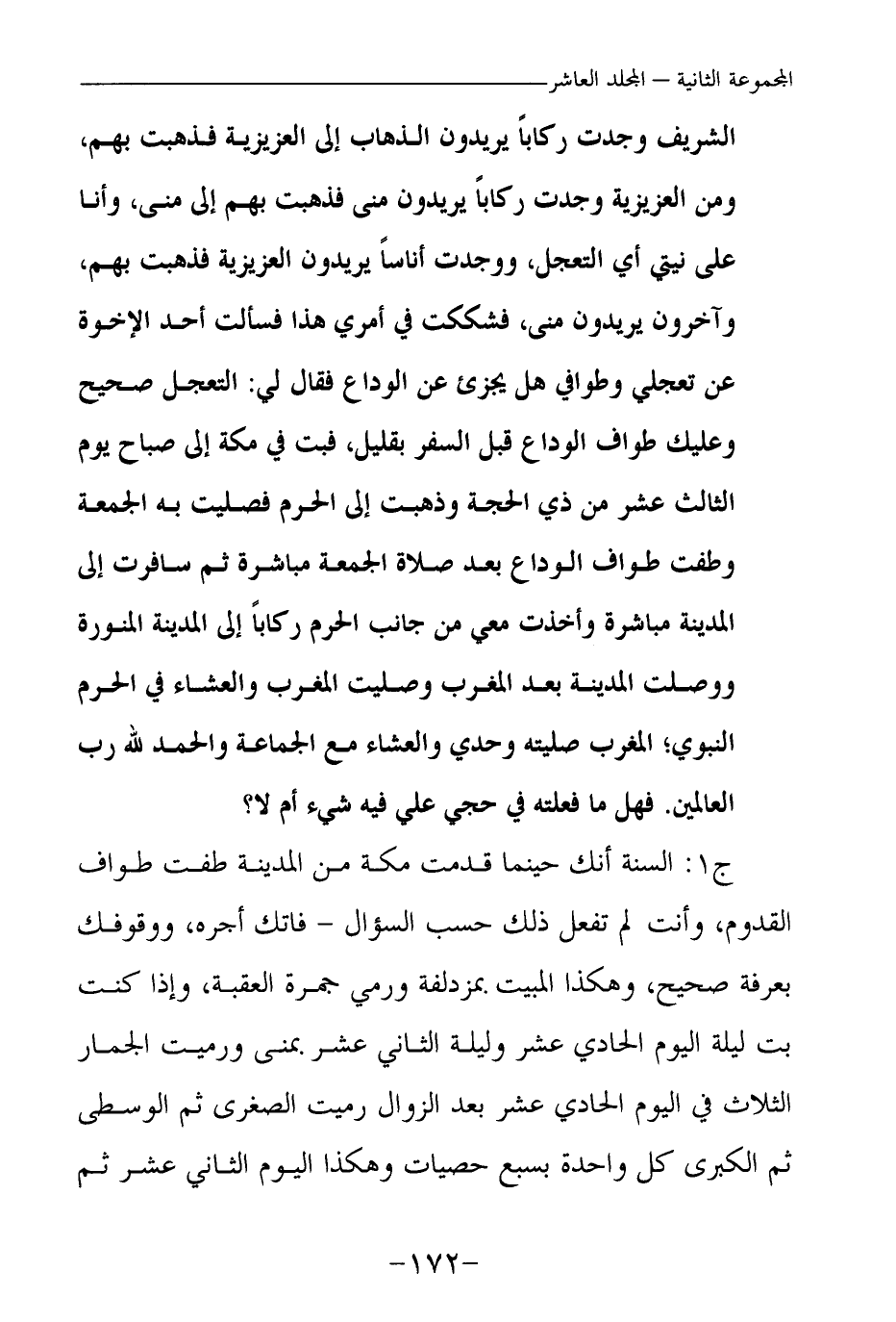 الشريف وجدت ركابا يريدون الذهاب إلى العزيزية فذهبت بهم، ومن العزيزية وجدت ركابا يريدون منى، فذهبت بهم إلى منى، وأنا على نيتي؛ أي التعجل، ووجدت أناسا يريدون العزيزية فذهبت بهم، وآخرون يريدون منى، فشككت في أمري هذا فسألت أحد الإخوة عن تعجلي وطوافي هل يجزئ عن الوداع فقال لي: التعجل صحيح وعليك طواف الوداع قبل السفر بقليل، فبت في مكة إلى صباح يوم الثالث عشر من ذي الحجة. وذهبت إلى الحرم فصليت به الجمعة وطفت طواف الوداع بعد صلاة الجمعة مباشرة.