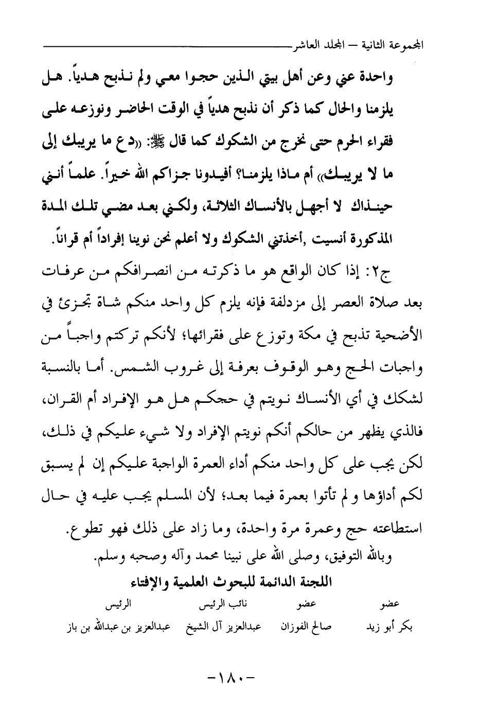 واحدة عني وعن أهل بيتي الذين حجوا معي ولم نذبح هديا. هل يلزمنا والحال كما ذكر أن نذبح هديا في الوقت الحاضر ونوزعه على فقراء الحرم حتى نخرج من الشكوك كما قال -صلى الله عليه وسلم-: «دع ما يريبك إلى ما لا يريبك (¬1) » . أم ماذا يلزمنا؟ أفيدونا جزاكم الله خيرا. علما أنني حينذاك لا أجهل بالأنساك الثلاثة، ولكني بعد مضي تلك المدة المذكورة أنسيت, وأخذتني الشكوك ولا أعلم نحن نوينا إفرادا أم قرانا.