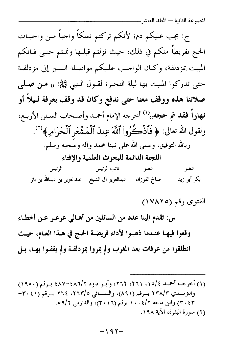 ج: يجب عليكم دم؛ لأنكم تركتم نسكا واجبا من واجبات الحج تفريطا منكم في ذلك، حيث نزلتم قبلها ونمتم حتى فاتكم المبيت بمزدلفة، وكان الواجب عليكم مواصلة السير إلى مزدلفة حتى تدركوا المبيت بها ليلة النحر؛ لقول النبي -صلى الله عليه وسلم-: «من صلى صلاتنا هذه ووقف معنا حتى ندفع وكان قد وقف بعرفة ليلا أو نهارا فقد تم حجه (¬1) » أخرجه الإمام أحمد وأصحاب السنن الأربع، ولقول الله تعالى: {فَاذْكُرُوا اللَّهَ عِنْدَ الْمَشْعَرِ الْحَرَامِ} (¬2) .