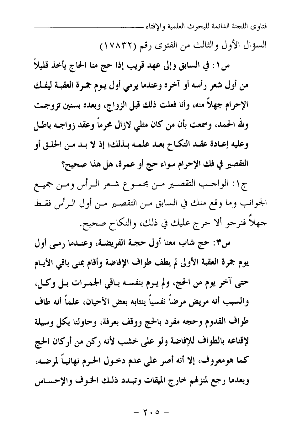 س1: في السابق وإلى عهد قريب إذا حج منا الحاج يأخذ قليلا من أول شعر رأسه أو آخره وعندما يرمي أول يوم جمرة العقبة ليفك الإحرام جهلا منه، وأنا فعلت ذلك قبل الزواج، وبعده بسنين تزوجت ولله الحمد، وسمعت بأن من كان مثلي لا زال محرما وعقد زواجه باطل، وعليه إعادة عقد النكاح بعد علمه بذلك؛ إذ لا بد من الحلق أو التقصير في فك الإحرام سواء حج أو عمرة، هل هذا صحيح؟