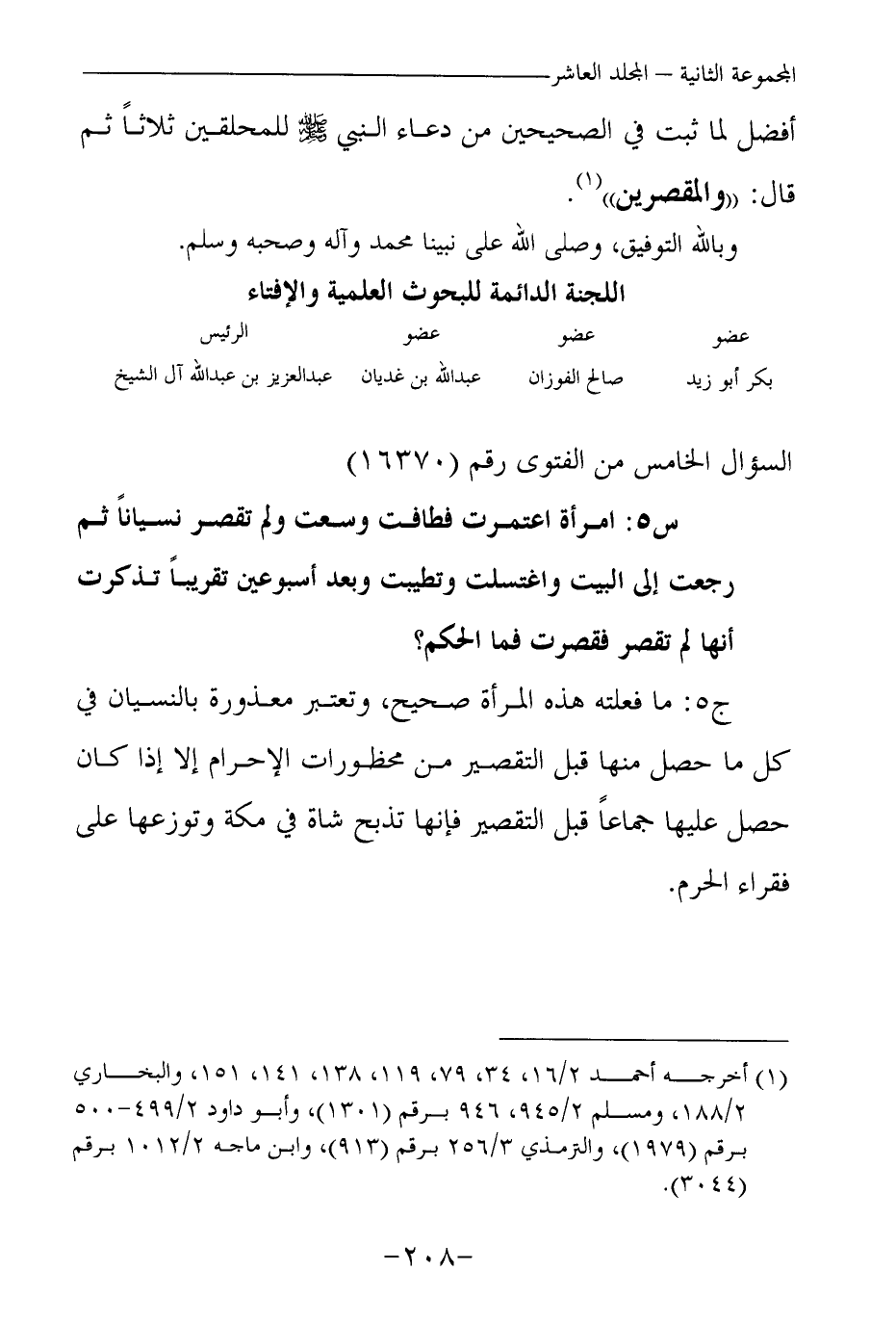 ج5: ما فعلته هذه المرأة صحيح، وتعتبر معذورة بالنسيان في كل ما حصل منها قبل التقصير من محظورات الإحرام إلا إذا كان حصل عليها جماعا قبل التقصير فإنها تذبح شاة في مكة وتوزعها على فقراء الحرم.