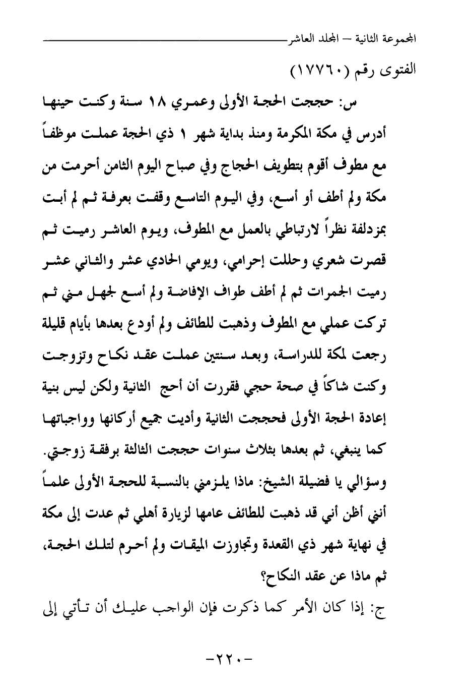 س: حججت الحجة الأولى وعمري 18 سنة وكنت حينها أدرس في مكة المكرمة، ومنذ بداية شهر 1 ذي الحجة عملت موظفا مع مطوف أقوم بتطويف الحجاج، وفي صباح اليوم الثامن أحرمت من مكة ولم أطف أو أسع، وفي اليوم التاسع وقفت بعرفة، ثم لم أبت بمزدلفة نظرا لارتباطي بالعمل مع المطوف، ويوم العاشر رميت ثم قصرت شعري وحللت إحرامي، ويومي الحادي عشر والثاني عشر رميت الجمرات، ثم لم أطف طواف الإفاضة ولم أسع لجهل مني، ثم تركت عملي مع المطوف وذهبت للطائف ولم أودع، بعدها بأيام قليلة رجعت لمكة للدراسة، وبعد سنتين عملت عقد نكاح وتزوجت وكنت شاكا في صحة حجي فقررت أن أحج الثانية، ولكن ليس بنية إعادة الحجة الأولى، فحججت الثانية وأديت جميع أركانها وواجباتها كما ينبغي، ثم بعدها بثلاث سنوات حججت الثالثة برفقة زوجتي. وسؤالي يا فضيلة الشيخ: ماذا يلزمني بالنسبة للحجة الأولى علما أنني أظن أني قد ذهبت للطائف عامها لزيارة أهلي، ثم عدت إلى مكة في نهاية شهر ذي القعدة وتجاوزت الميقات ولم أحرم لتلك الحجة، ثم ماذا عن عقد النكاح؟