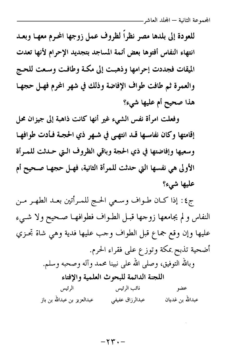 وفعلت امرأة نفس الشيء، غير أنها كانت ذاهبة إلى جيزان محل إقامتها، وكان نفاسها قد انتهى في شهر ذي الحجة، فأدت طوافها وسعيها وإفاضتها في ذي الحجة، وباقي الظروف التي حدثت للمرأة الأولى هي نفسها التي حدثت للمرأة الثانية، فهل حجها صحيح أم عليها شيء؟
