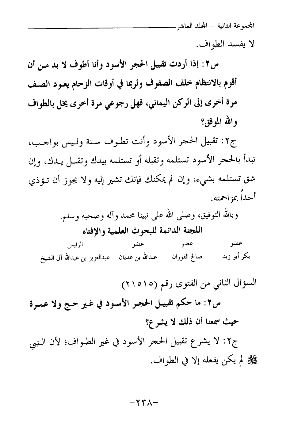 ج2: تقبيل الحجر الأسود وأنت تطوف سنة وليس بواجب، تبدأ بالحجر الأسود تستلمه وتقبله، أو تستلمه بيدك وتقبل يدك، وإن شق تستلمه بشيء، وإن لم يمكنك فإنك تشير إليه ولا يجوز أن تؤذي أحدا بمزاحمته.